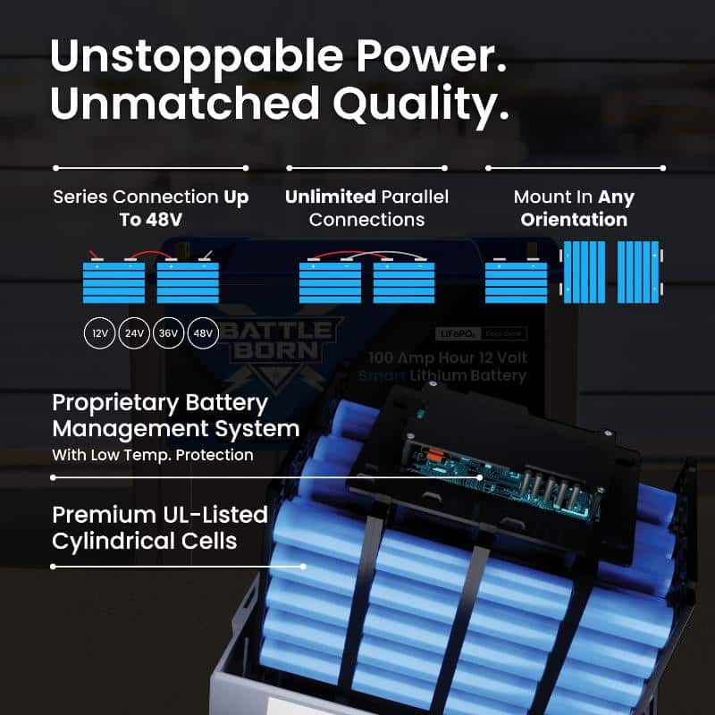 The Battle Born 100 Ampere Hour 12 Volt Smart Lithium Deep Cycle Battery is a reliable and intelligent energy storage option designed for a wide range of applications, including RVs, camper vans, boats, and off-grid systems. This lithium battery combines advanced technology with safety features to provide a long-lasting power source for your needs.