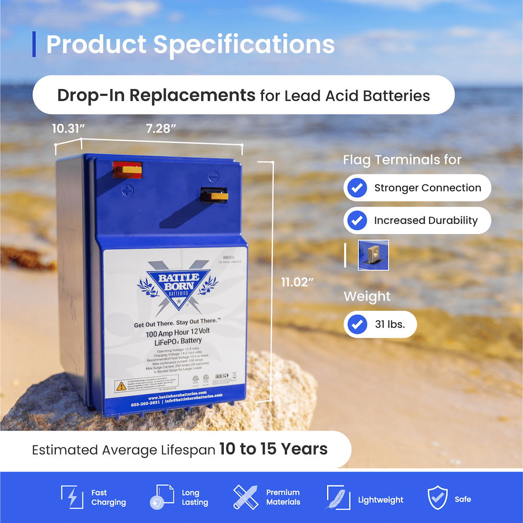 The Battle Born Batteries 12 Volt Lithium Deep Cycle Battery is engineered to deliver exceptional performance and longevity. With a capacity of 100 Ampere Hours and advanced heating technology, this battery ensures reliable power even in cold conditions, making it suitable for RVs, camper vans, boats, and off-grid applications.