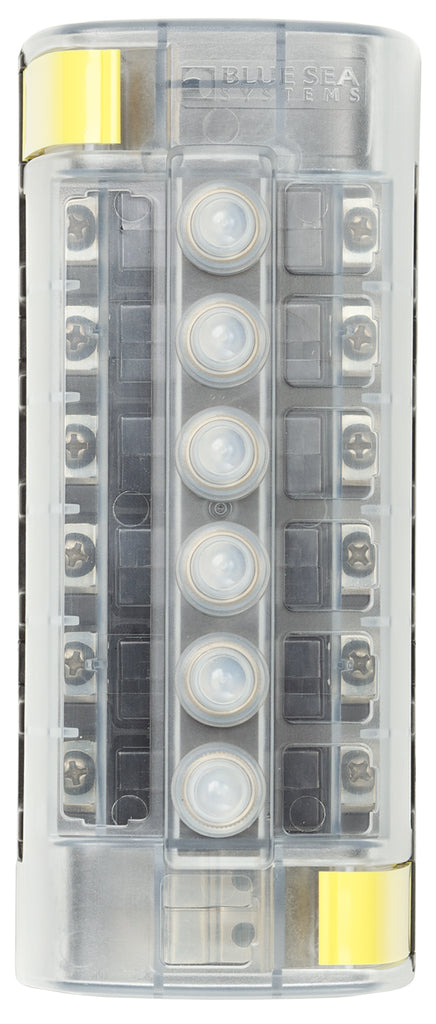 The Blue Sea Circuit Breaker Block offers a reliable solution for circuit protection with its innovative design. This 6-position independent source block is engineered for maximum efficiency, accommodating up to 32 amps per circuit and 40 amps for jumped circuits. Its snap-in mounting feature simplifies installation, making it as straightforward as using a fuse.