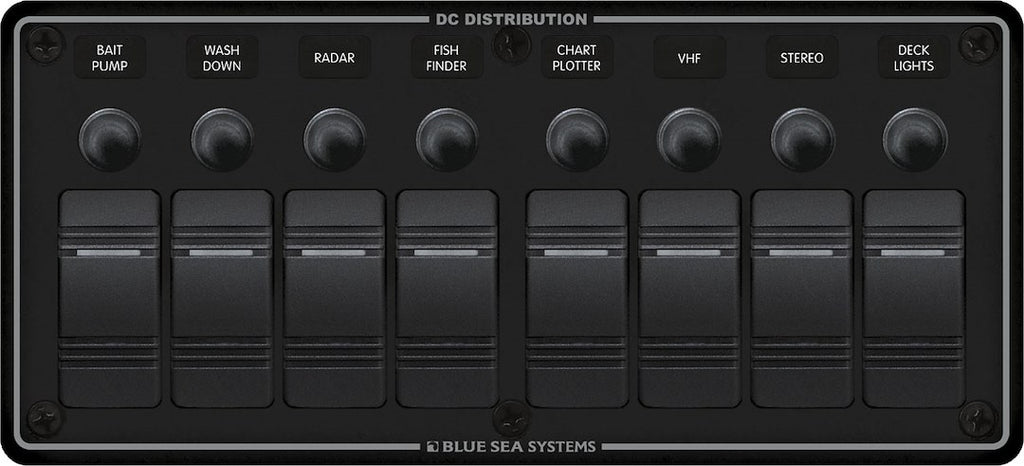 The Blue Sea Switch Panel is engineered for marine environments, featuring eight rocker switches with LED indicator lights. This panel is designed to operate efficiently in both 12 and 24 Volt DC systems, making it suitable for various applications on boats. Its robust construction ensures reliable performance above deck and enhances the interior aesthetics of your vessel.