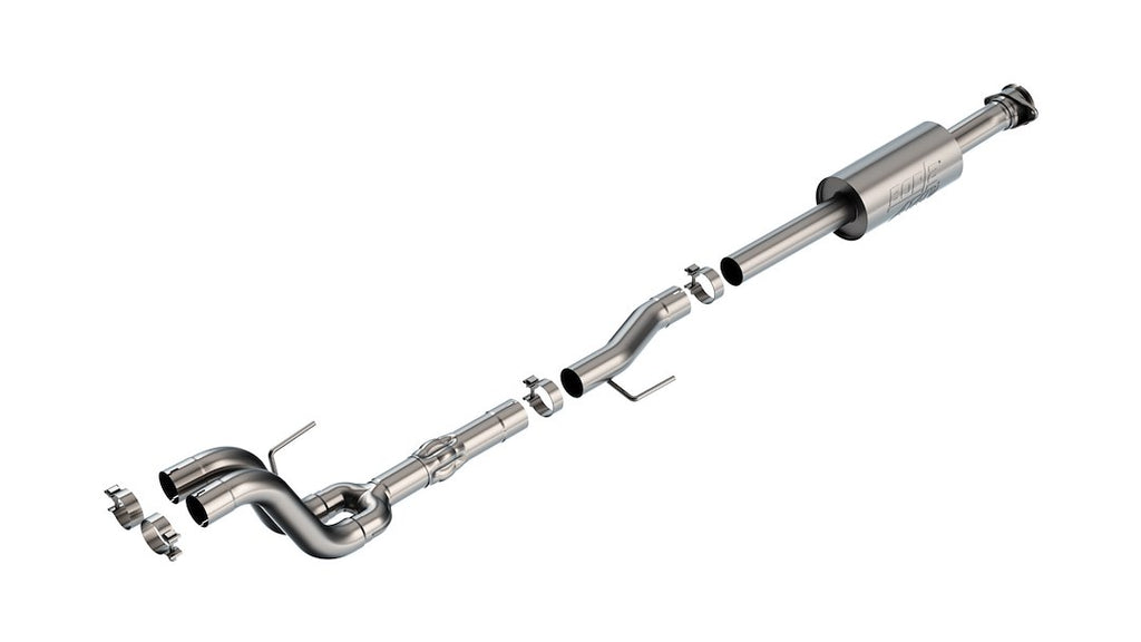 The Borla Exhaust System Kit, part of the ATAK Series, is engineered to deliver an aggressive sound and improved performance. Constructed from T-304 stainless steel, this cat-back system features a 3-inch pipe diameter and is designed to fit with either original equipment (OE) tail pipes or Borla tail pipes, which are sold separately. The innovative design utilizes patented straight-through and multi-core technology to maximize exhaust flow, resulting in increased horsepower and fuel efficiency.