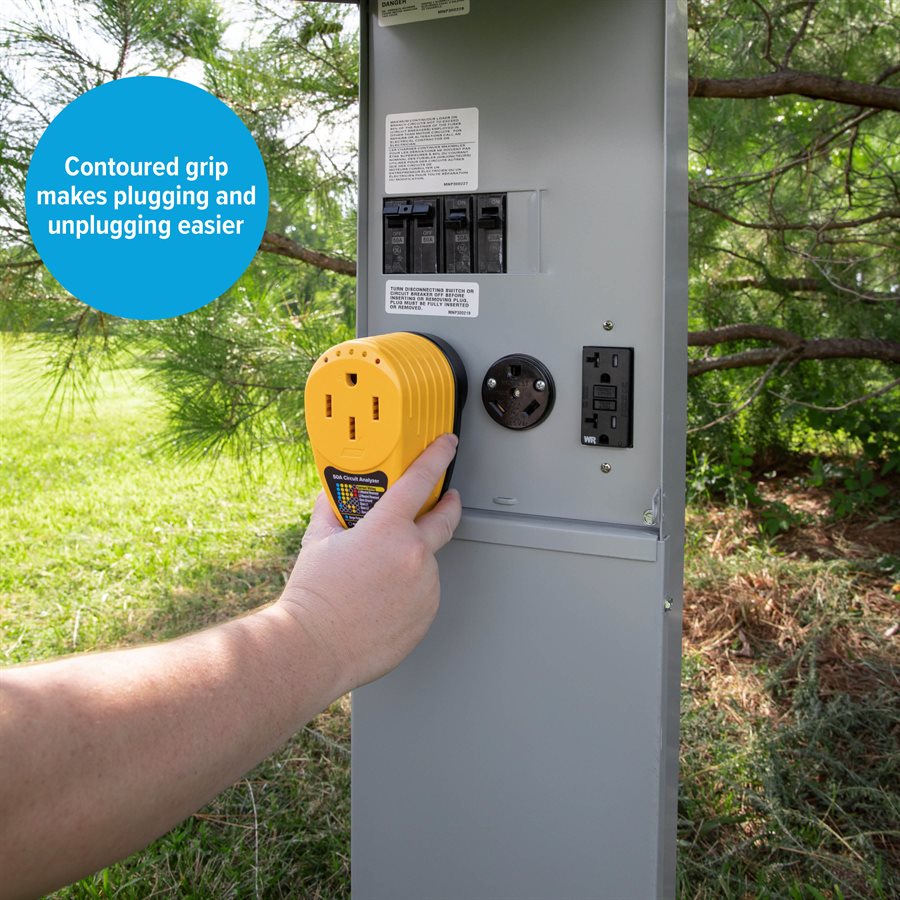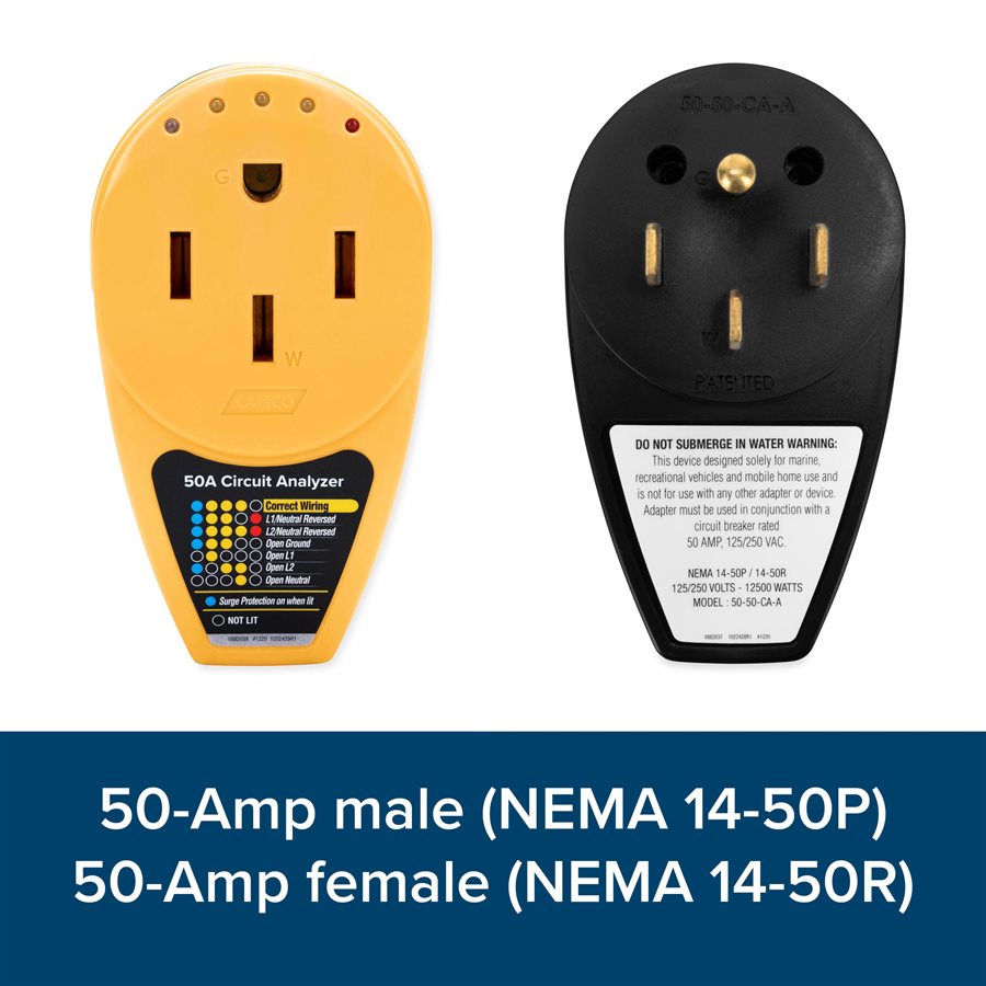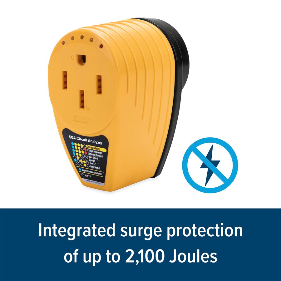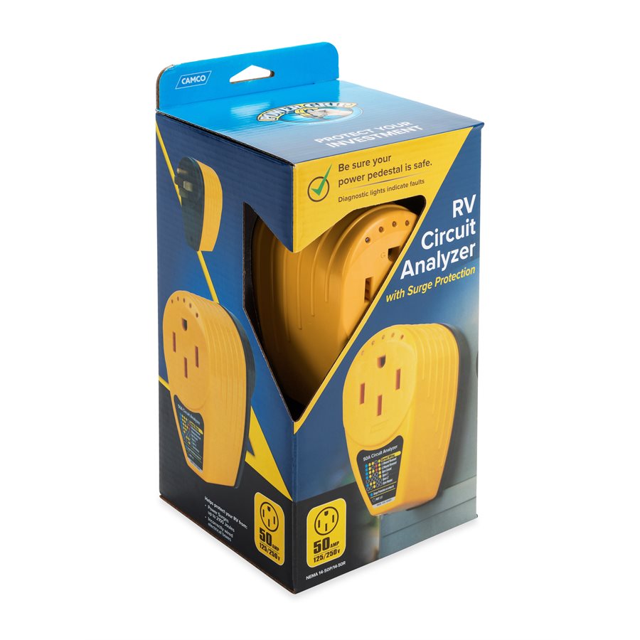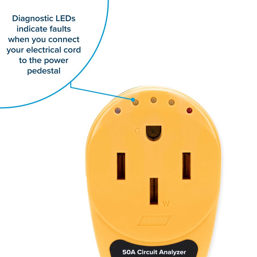 The Camco 50-Amp Circuit Analyzer is designed to safeguard your RV's electrical system by identifying faults and protecting against power surges. This essential tool features diagnostic LEDs that alert you to wiring issues, ensuring a reliable connection to power pedestals.