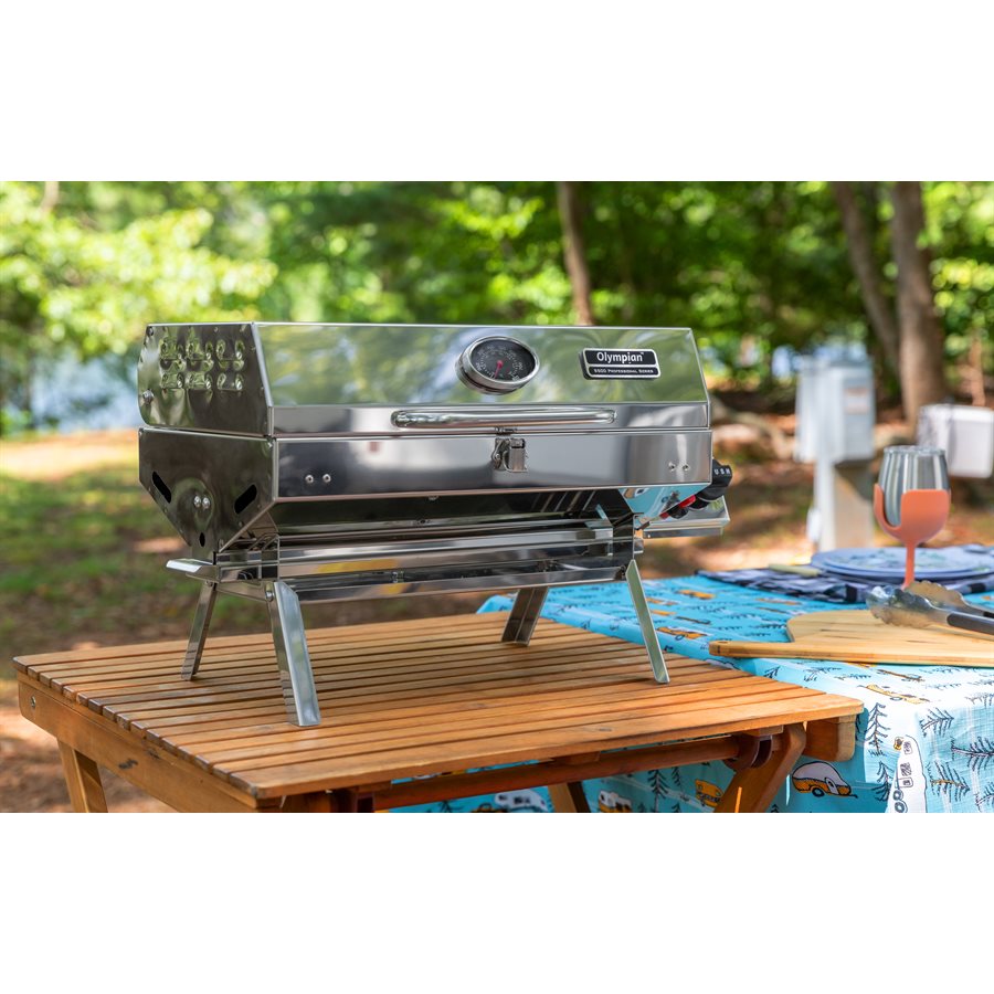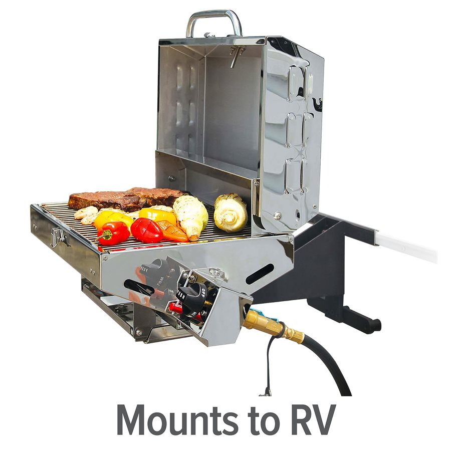This Camco propane barbeque grill is designed for both RV and outdoor use, providing a high-quality cooking experience with enhanced flavor and minimal flare-ups. Its lightweight stainless steel construction ensures durability while the foldable legs allow for easy grilling on any flat surface. The grill can also be mounted to your RV using the Olympian RV mounting rail bracket, making it a convenient option for outdoor enthusiasts.