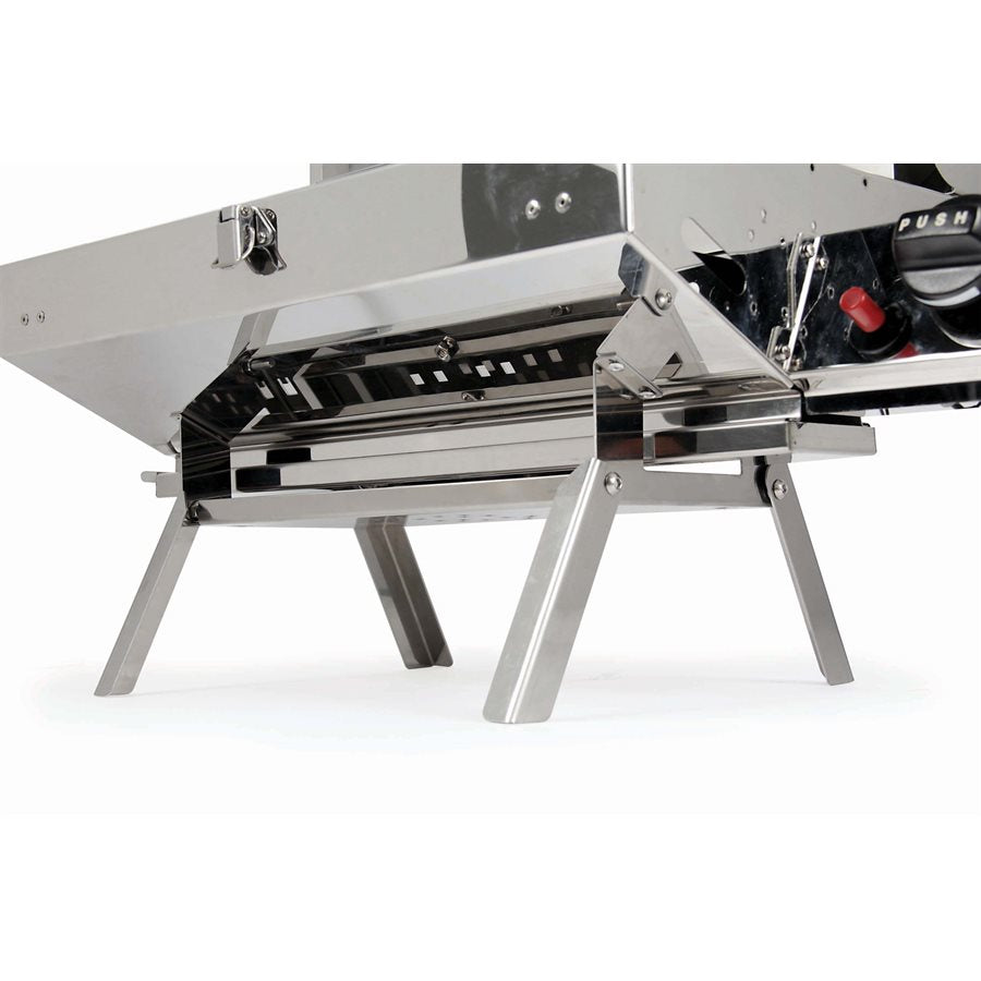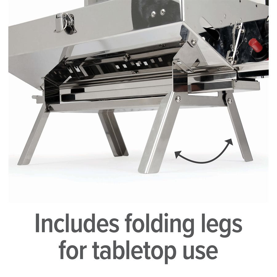 - Integrated fold-away legs for easy grilling on flat surfaces