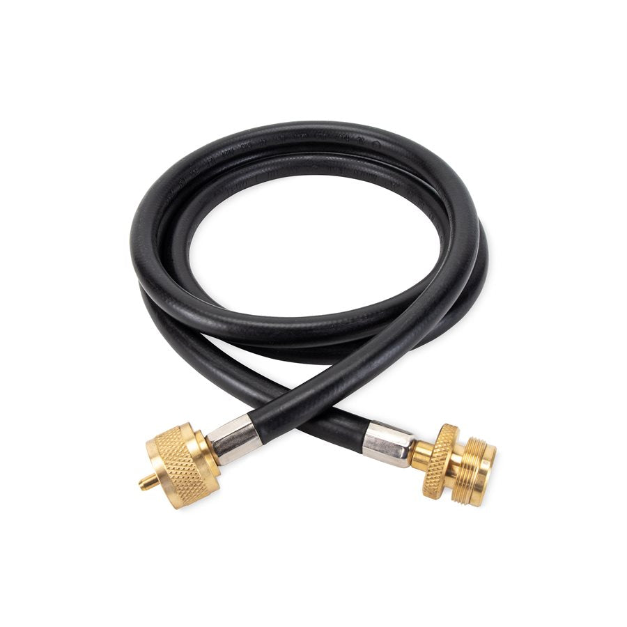 The Camco Propane Hose is a 5-foot extension designed to connect appliances that utilize a 1-pound disposable propane cylinder to a tee, "Y", or distribution tree. This hose is also suitable for linking appliances to your motorhome's onboard LP system, ensuring a secure and efficient propane supply.