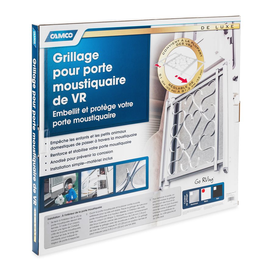The Camco Screen Door Grille is designed to provide robust protection for your RV screen door while enhancing its aesthetic appeal. Featuring a deluxe scroll design, this grille is adjustable from 20 inches to 32 inches, ensuring a perfect fit for various door sizes. Constructed from durable aluminum, it not only adds a sturdy feel to your door but also helps prevent damage to screens, making it a practical addition to your RV.