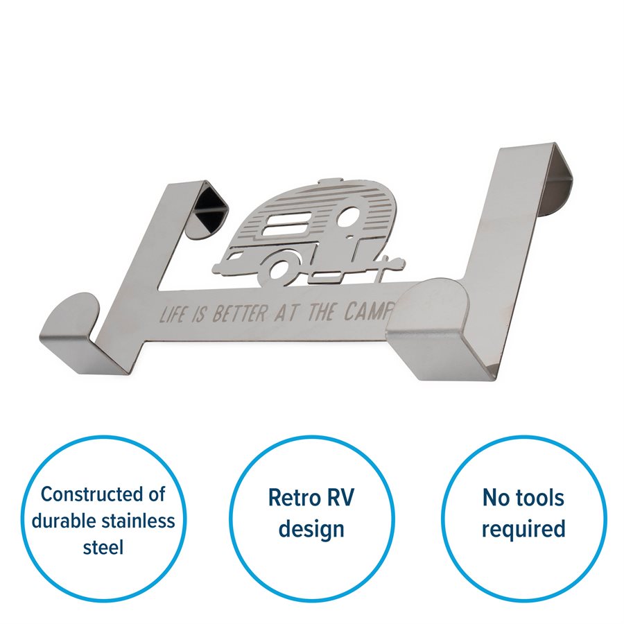 The Camco Towel Rack is designed to provide efficient storage for towels, bathrobes, jackets, hats, and more. Its over-the-door mount allows for easy installation on doors up to 3/4 inch thick, making it a practical addition to any small space. The stylish silver retro RV design features the phrase "Life Is Better At The Campsite," adding a touch of charm to your decor.