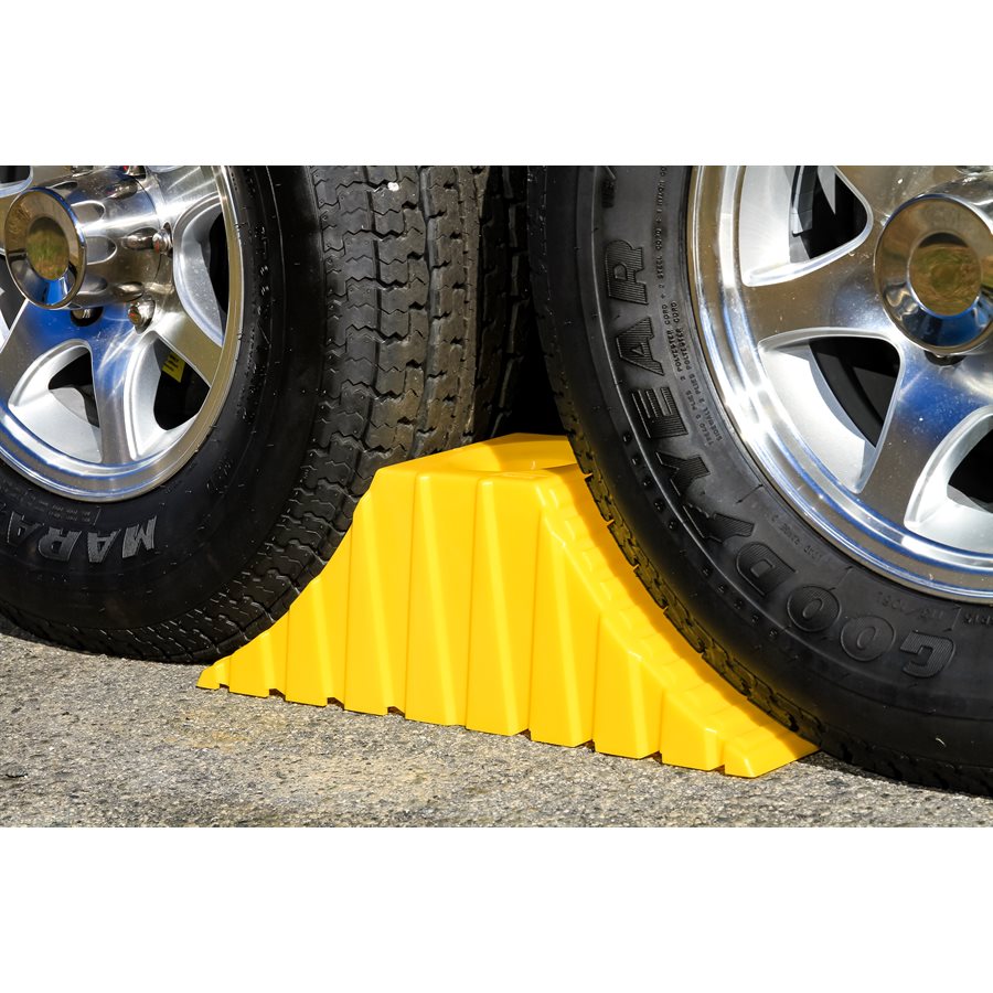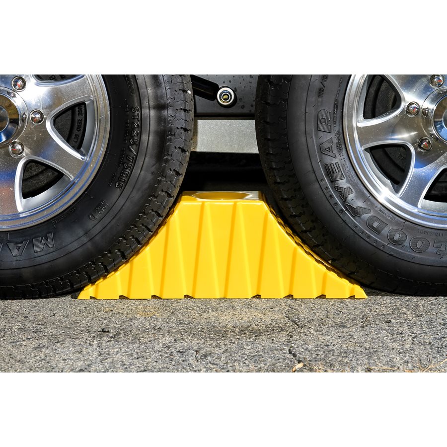 The Camco Wheel Chock is designed to provide stability and security for tandem axle trailers. Made from durable hard plastic, this wheel chock features UV inhibitors to withstand outdoor conditions, ensuring long-lasting performance. Its bright yellow color enhances visibility, making it easy to locate when needed.