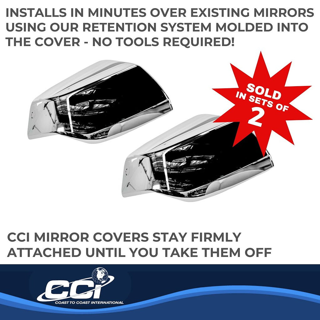 The Coast To Coast MC67548 Exterior Mirror Cover is designed to provide a stylish upgrade to your vehicle's appearance. This set of two top half covers is crafted from high-quality ABS plastic and features a chrome plated finish, ensuring durability and a sleek look. The covers are specifically designed to overlay the OEM mirrors, offering a factory-style enhancement without the need for extensive modifications.
