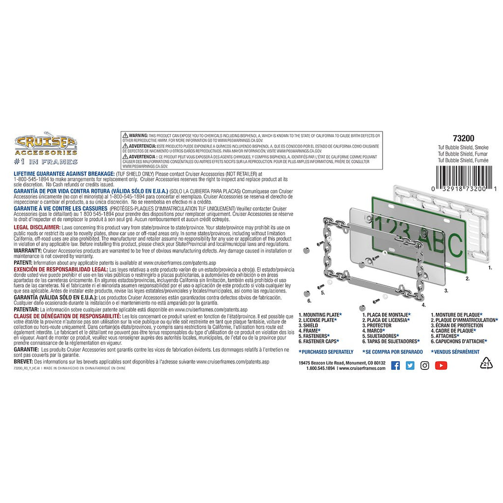 The Cruiser Tuf Bubble Shield is designed to provide exceptional protection for your novelty or license plate against various environmental elements. Constructed from unbreakable polycarbonate, this smoke shield features a UV-resistant stabilizer to maintain its clarity and prevent discoloration over time.