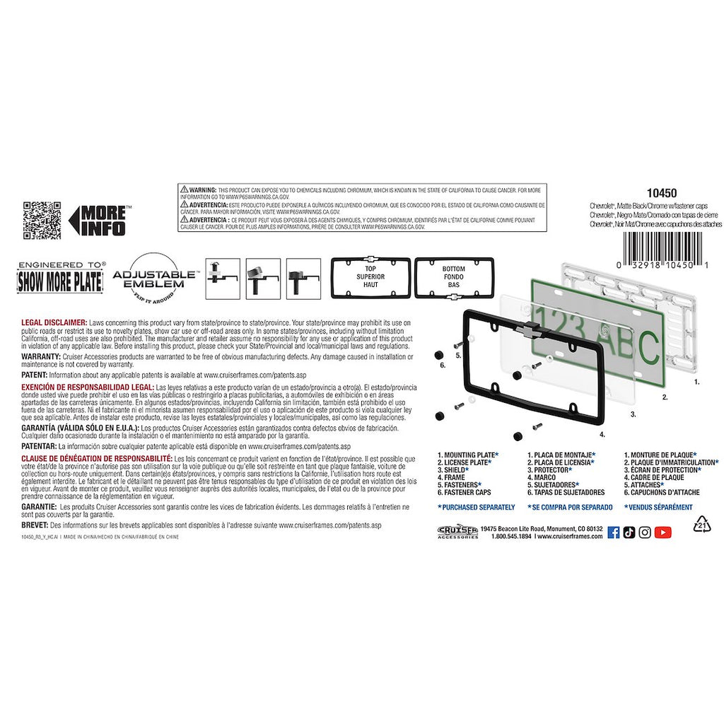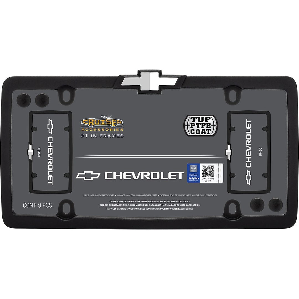 The Cruiser 10450 License Plate Frame is designed to showcase your Chevrolet pride while providing a durable and stylish solution for mounting your license plate. This frame features a matte black PTFE coated finish and a two-toned chrome plated Chevy bowtie emblem, ensuring that your vehicle stands out on the road.