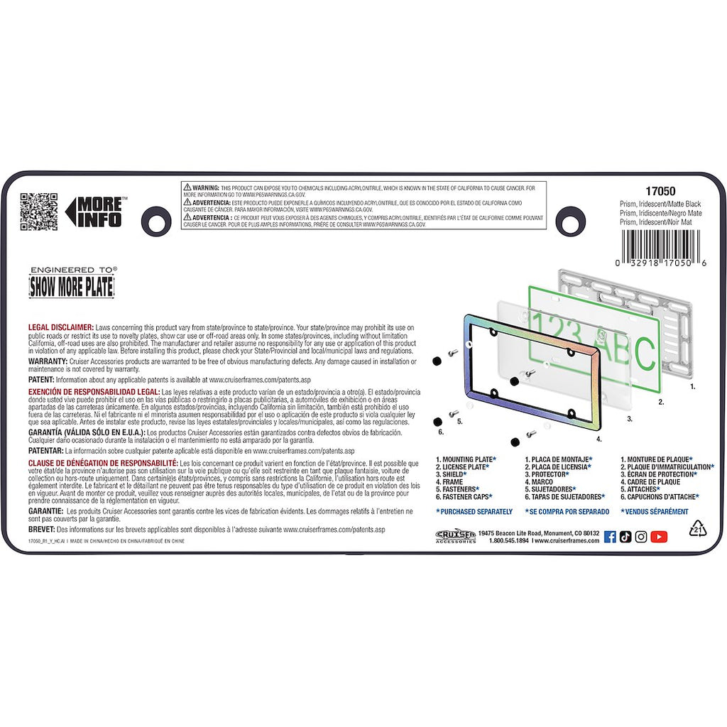 The Cruiser 17050 License Plate Frame features a unique prism iridescent design on a matte black base, providing a modern and subtle aesthetic. This frame is engineered to enhance the appearance of your vehicle while ensuring that state and registration information remains visible. Its highly reflective surface shifts colors in sunlight, creating a captivating display that transitions from solid silver to a vibrant spectrum of colors.