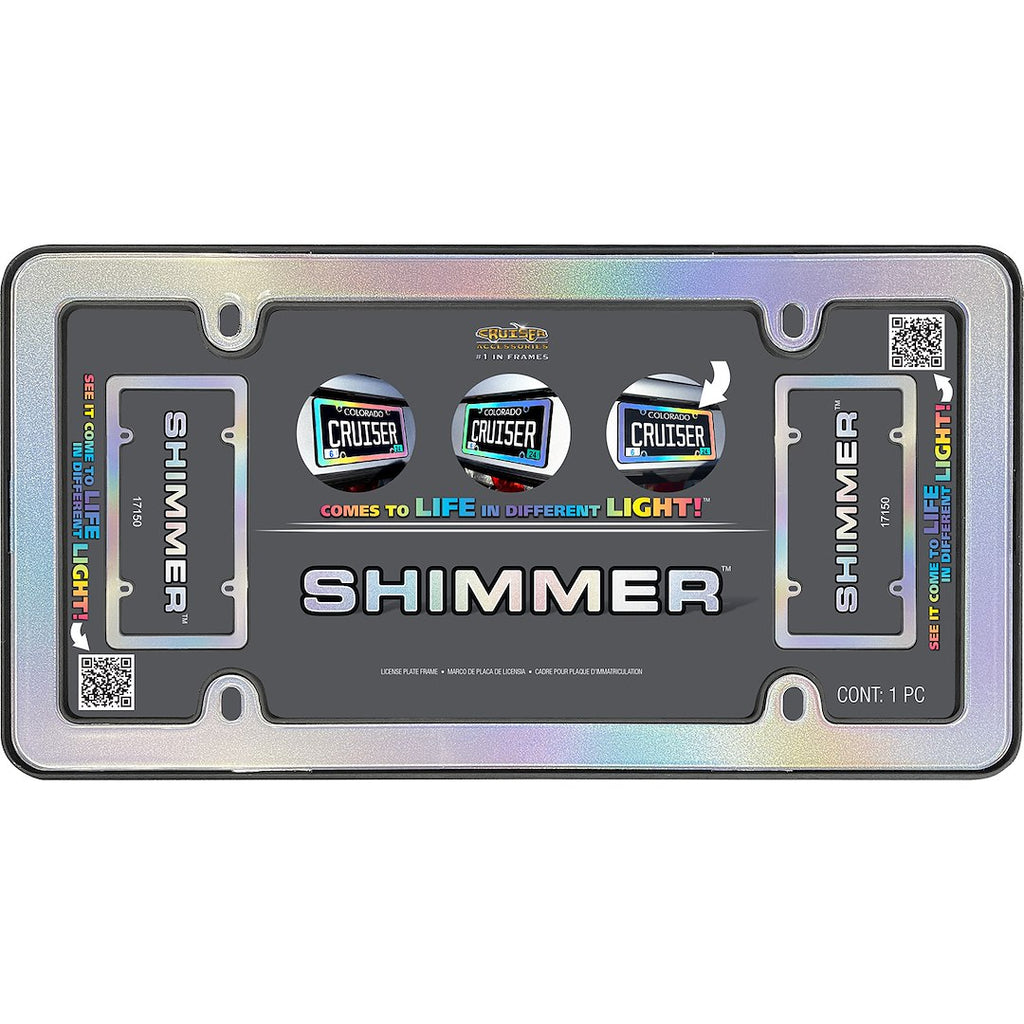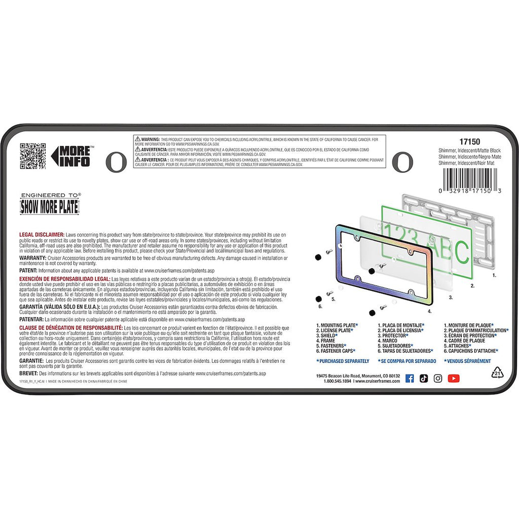 The Cruiser 17150 License Plate Frame features a striking shimmer iridescent design that showcases a vibrant spectrum of colors when exposed to sunlight. This frame is crafted from durable die-cast metal with a matte black powder coating, ensuring longevity and resistance to the elements. The unique color-shifting insert, made from unbreakable polycarbonate, is UV protected to maintain its brilliance over time.