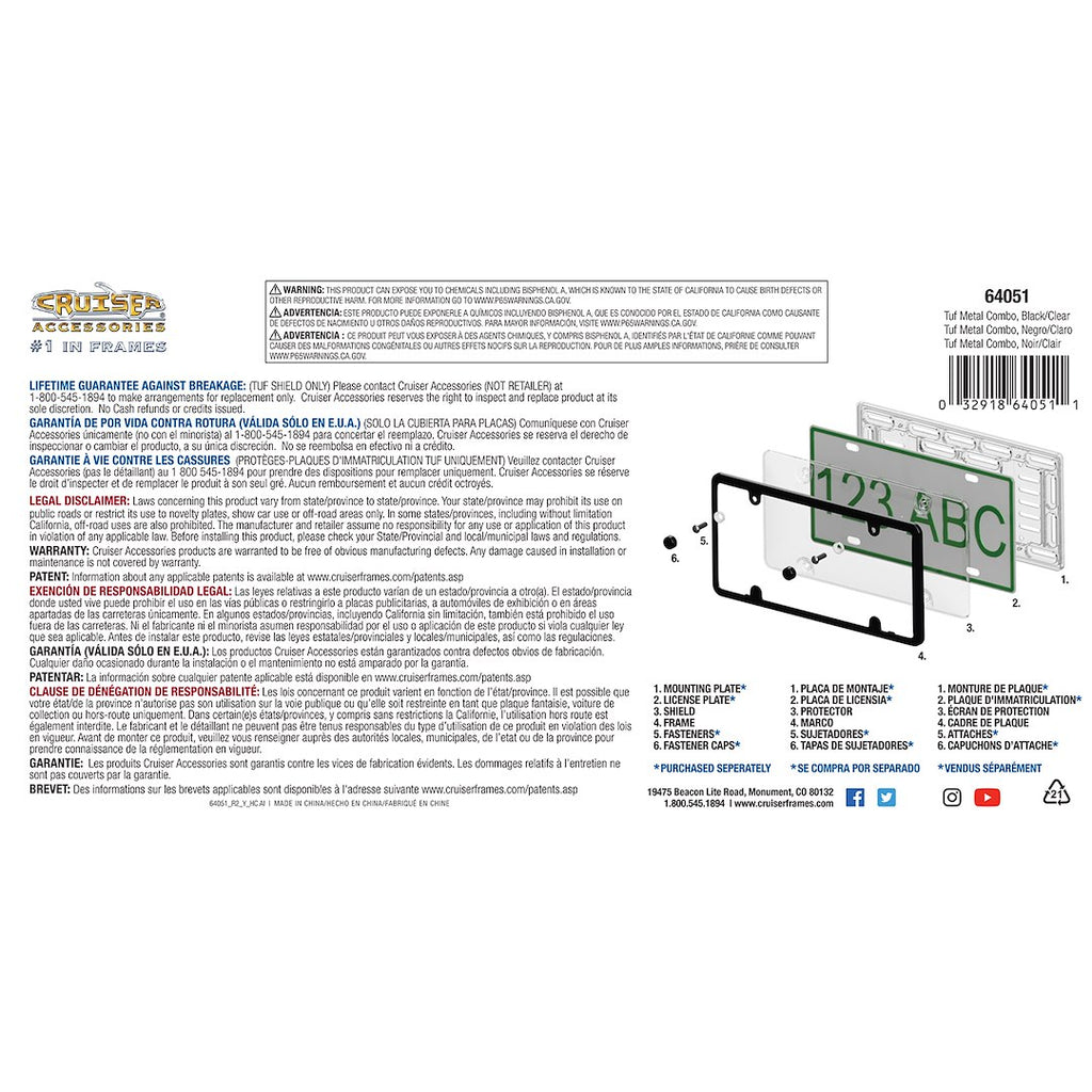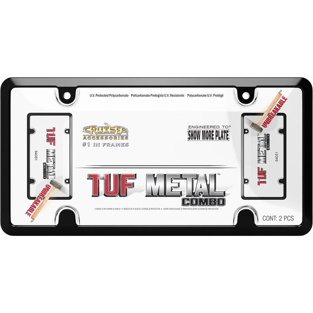 The Cruiser 64051 License Plate Frame is designed to elevate the aesthetic of your novelty or license plate while providing robust protection against environmental elements. This frame features a sleek black powder-coated finish and a durable clear polycarbonate shield, ensuring both style and longevity for your vehicle's registration display.