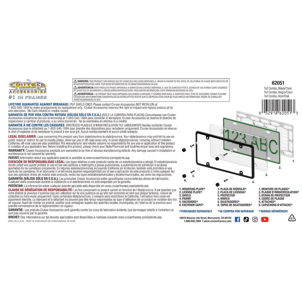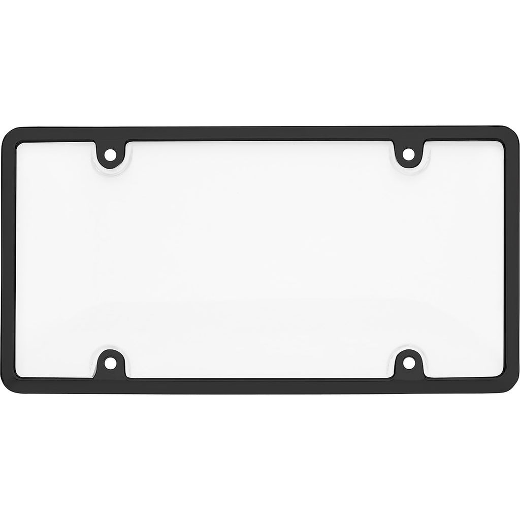 The Cruiser License Plate Frame with Tuf Shield is designed to elevate the aesthetic of your vehicle's license plate while providing robust protection against environmental factors. This frame features a sleek black design that seamlessly covers the edges of the plate and shield, ensuring a polished look.