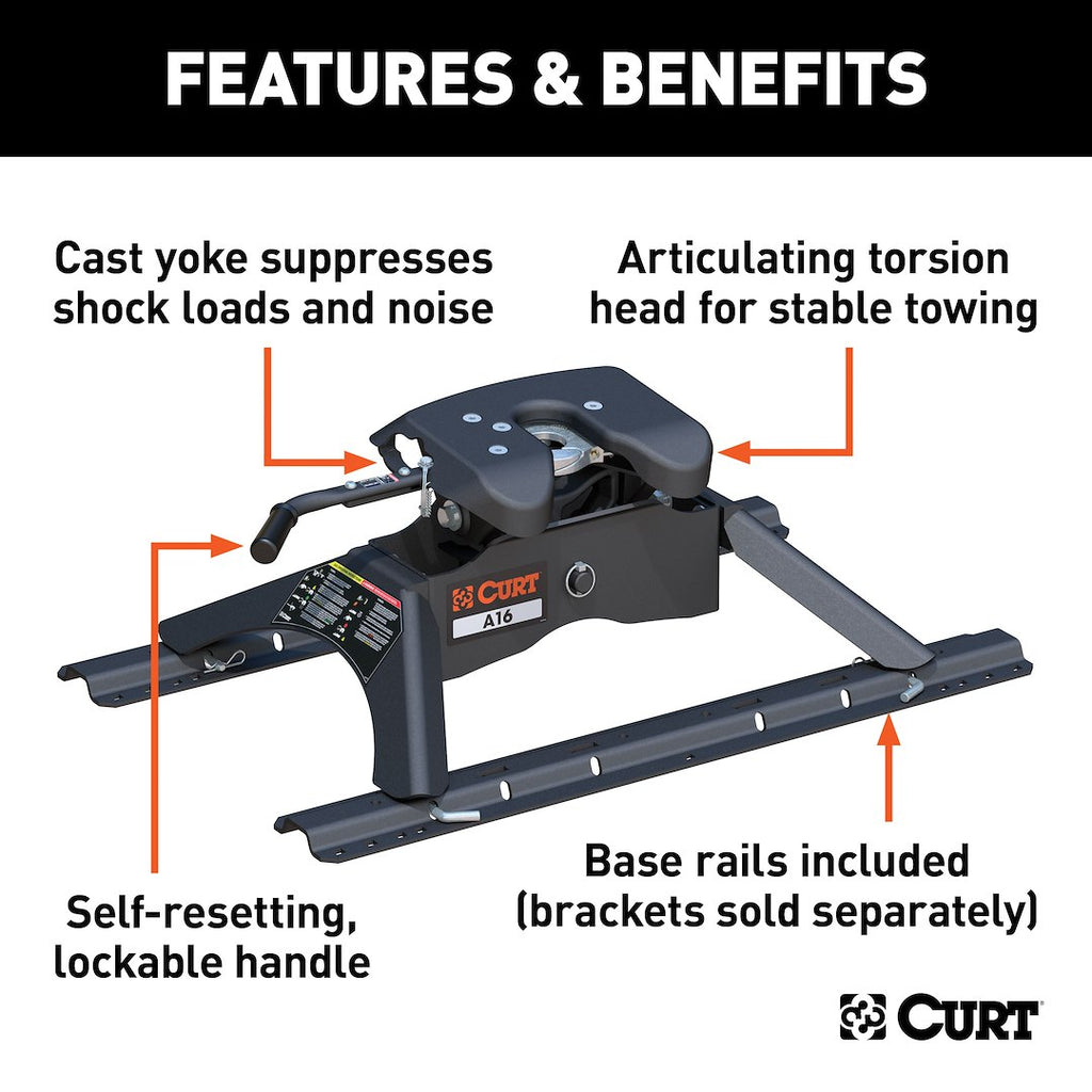 The CURT A16 Fifth Wheel Trailer Hitch is engineered to deliver a smooth and quiet towing experience while providing robust towing capabilities. With a gross trailer weight capacity of 16,000 pounds and a vertical load capacity of 4,000 pounds, this hitch is designed for heavy-duty performance. Its innovative features ensure stability and ease of use, making it a reliable choice for towing your fifth wheel trailer.