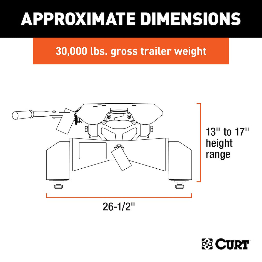 The CURT A30 Fifth Wheel Trailer Hitch is engineered for a smoother and quieter towing experience, making it an essential component for your towing setup. With a robust weight capacity of 30,000 pounds and a vertical load limit of 7,500 pounds, this hitch is designed to provide exceptional stability and ease of use. Its innovative features, including a fully articulating head and a user-friendly coupling indicator, ensure that you can tow with confidence and efficiency.