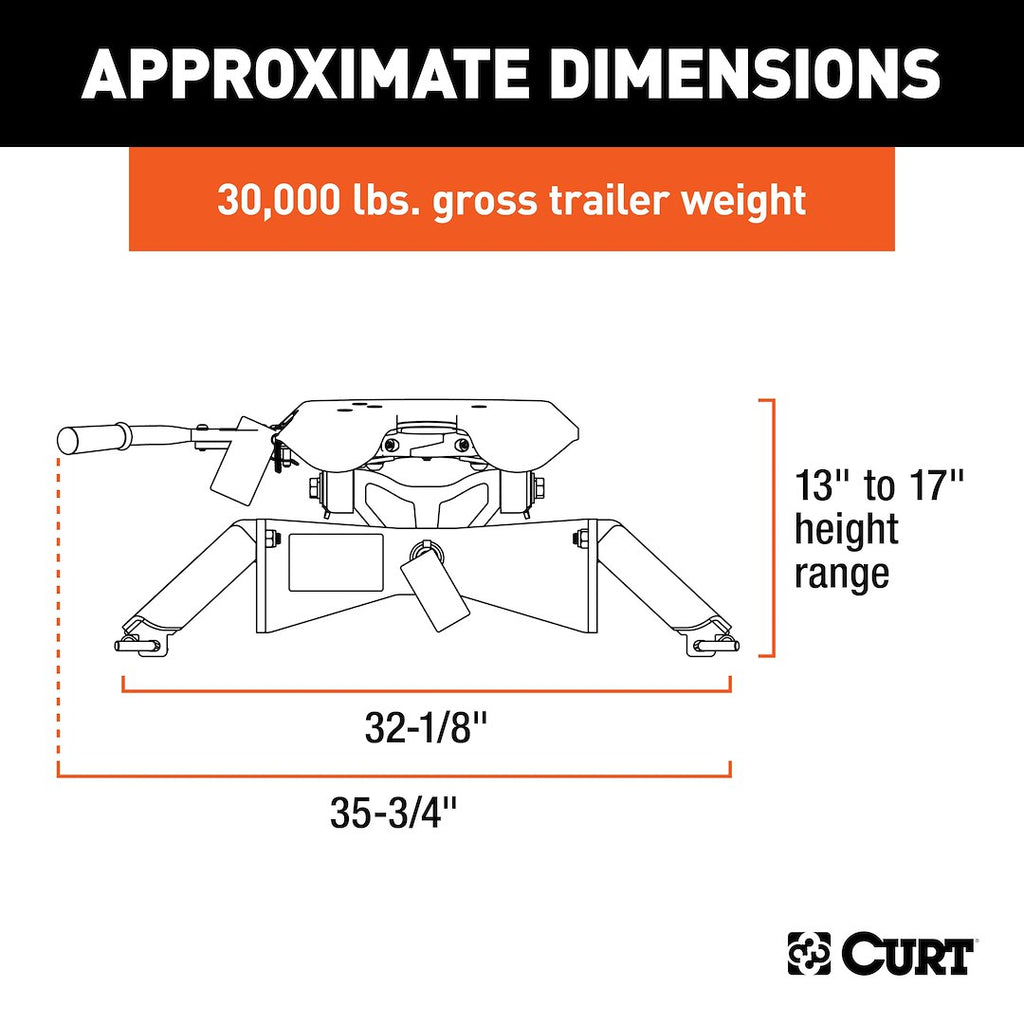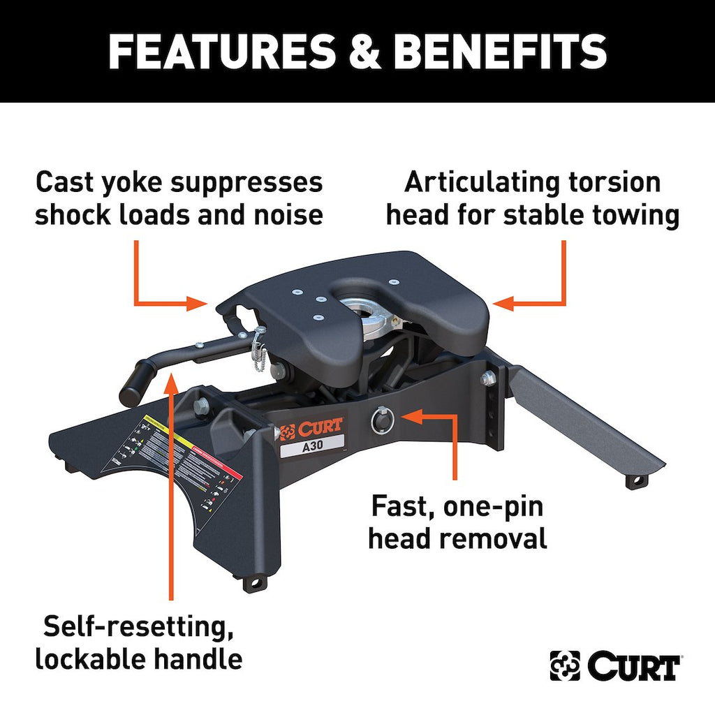 The CURT A30 Fifth Wheel Trailer Hitch is engineered for smooth and quiet towing, making it an essential component for your travel needs. With a robust weight capacity of 30,000 pounds and a vertical load limit of 7,500 pounds, this hitch combines innovative design with user-friendly features to ensure a reliable towing experience.