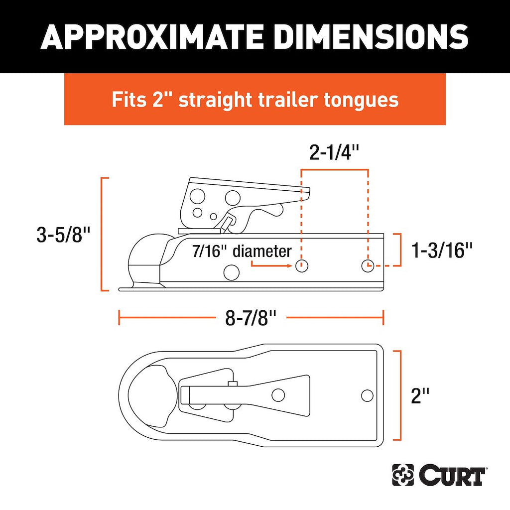 The Curt 72-1804 Trailer Coupler is designed for dependable performance, ensuring your trailer remains securely attached during transport. With a robust construction and a weight capacity of 2,000 pounds, this coupler is suitable for various towing applications. It is engineered to fit 2-inch wide straight trailer tongues and accepts 1-7/8 inch trailer balls, making it a versatile choice for your towing needs.
