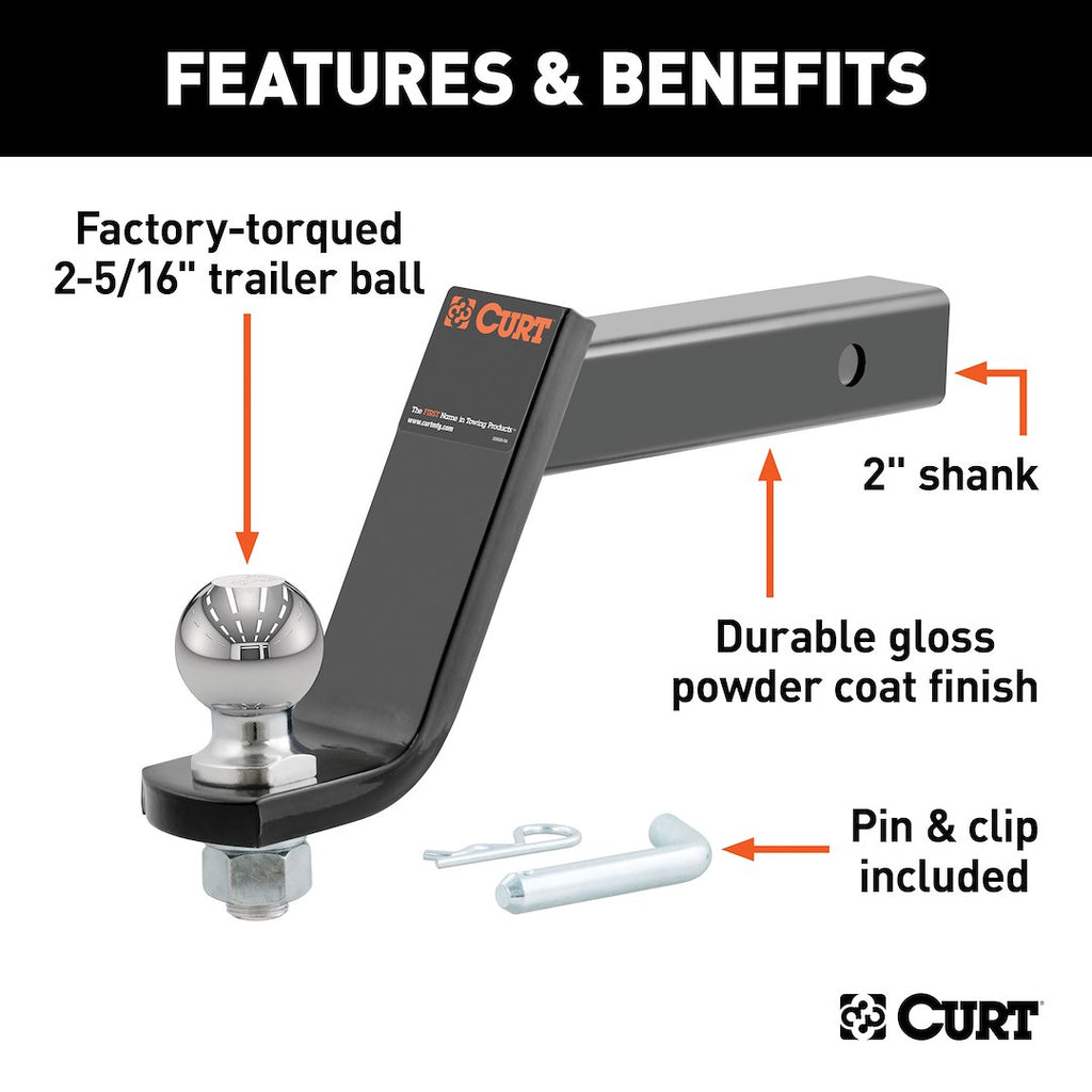 The Curt Trailer Hitch Ball Mount is designed for reliable towing, accommodating a gross trailer weight of up to 7500 pounds and a tongue weight of 750 pounds. This robust ball mount features a 6-inch drop, ensuring precise trailer leveling, especially for larger trucks. With a polished chrome-plated hitch ball and a durable powder coat finish, this product is built to withstand the rigors of towing.