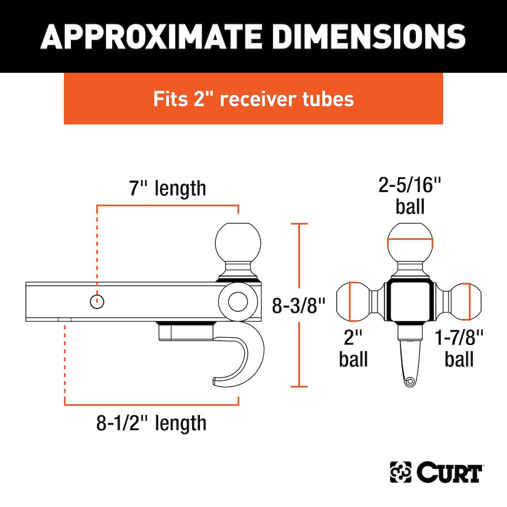The CURT Trailer Hitch Ball Mount is designed for versatility and strength, accommodating multiple trailer sizes with ease. This Class IV hitch features three different ball diameters and a tow hook, making it suitable for a wide range of towing applications. It fits any standard 2-inch receiver, allowing for quick and efficient trailer coupling without the need for multiple mounts.