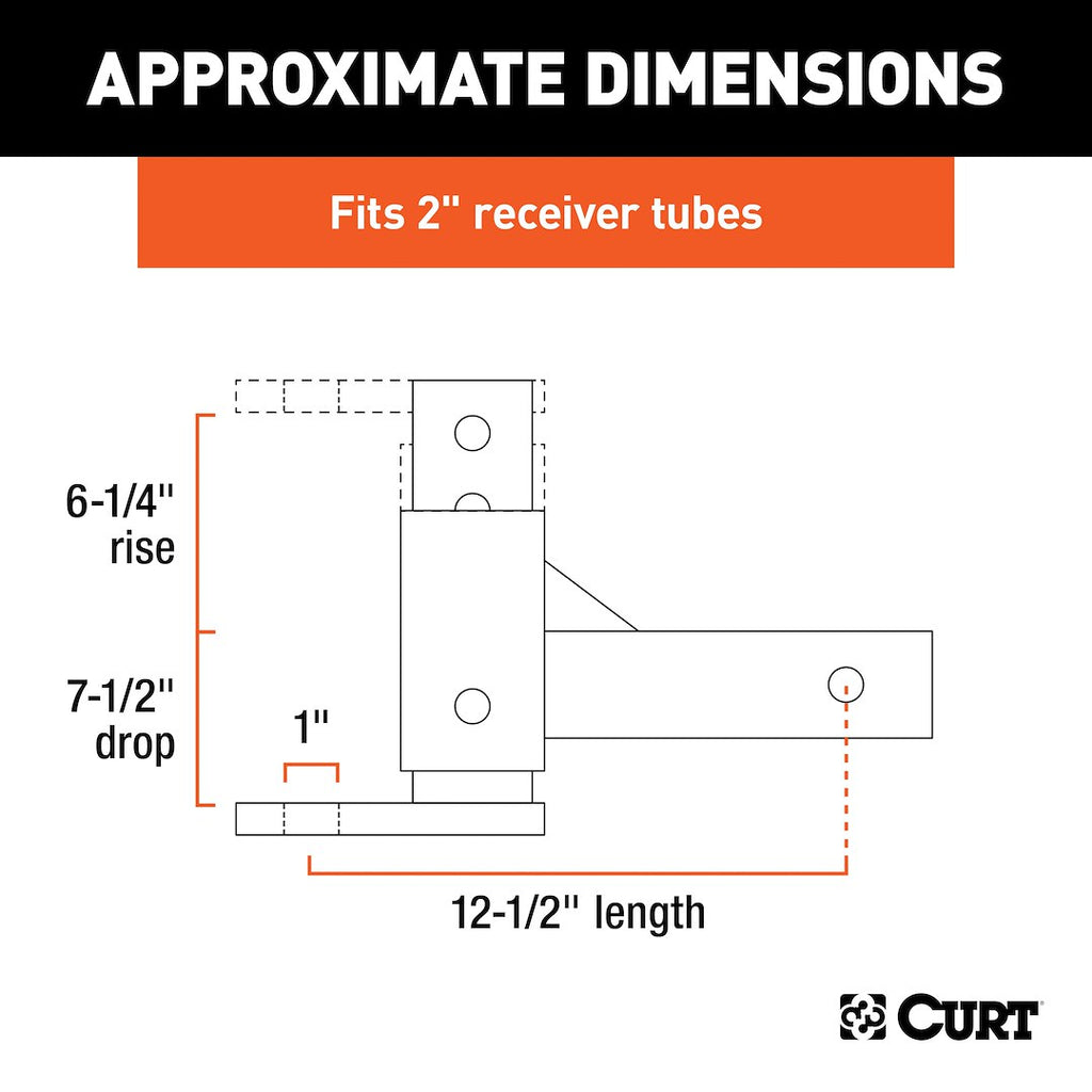 The CURT Trailer Hitch Ball Mount is designed for those who frequently tow various loads and own multiple trailers. This Class III ball mount fits a 2-inch receiver and offers a maximum gross trailer weight capacity of 5000 pounds and a tongue weight capacity of 500 pounds. Its adjustable design allows for a 7-1/2 inch drop and a 6-1/4 inch rise, providing flexibility to accommodate different coupler heights.