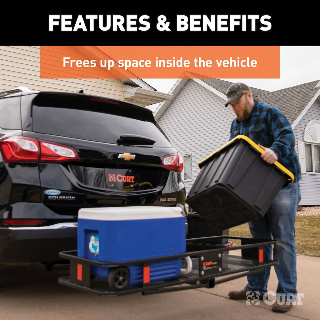 The CURT Trailer Hitch Cargo Carrier is designed to enhance your vehicle's storage capacity, making it an efficient solution for transporting additional cargo. This hitch-mounted carrier can be easily installed on either the front or rear of your vehicle, provided it is equipped with a compatible receiver hitch. Its versatile design allows for the option of towing a trailer or adding extra accessories while keeping your cargo secure.