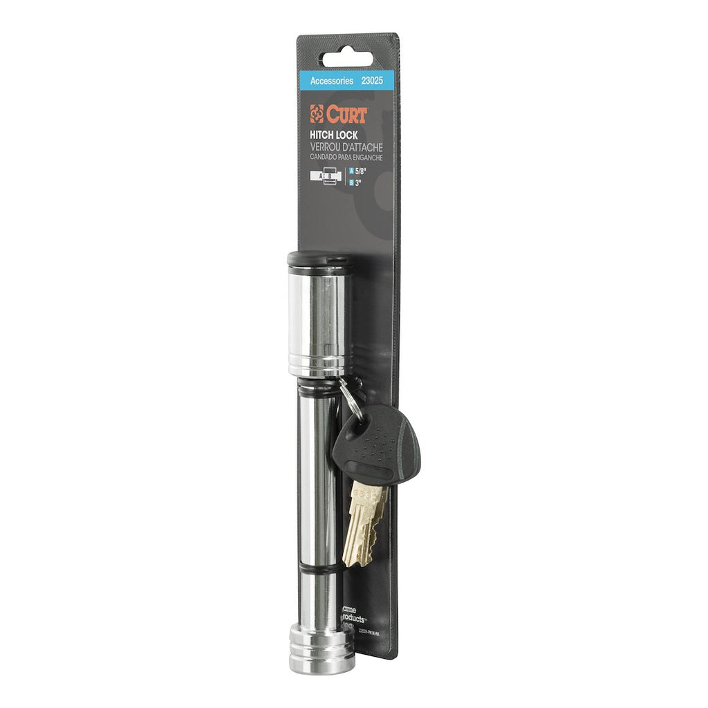 The CURT Trailer Hitch Lock is designed to provide superior security for your tow vehicle and trailer. This robust hitch lock features a barbell design with a 5/8 inch diameter pin, making it compatible with 2 inch, 2-1/2 inch, and 3 inch receiver tubes. It effectively secures your ball mount or hitch-mounted accessory, deterring theft and ensuring that your trailer remains safely attached to your vehicle.