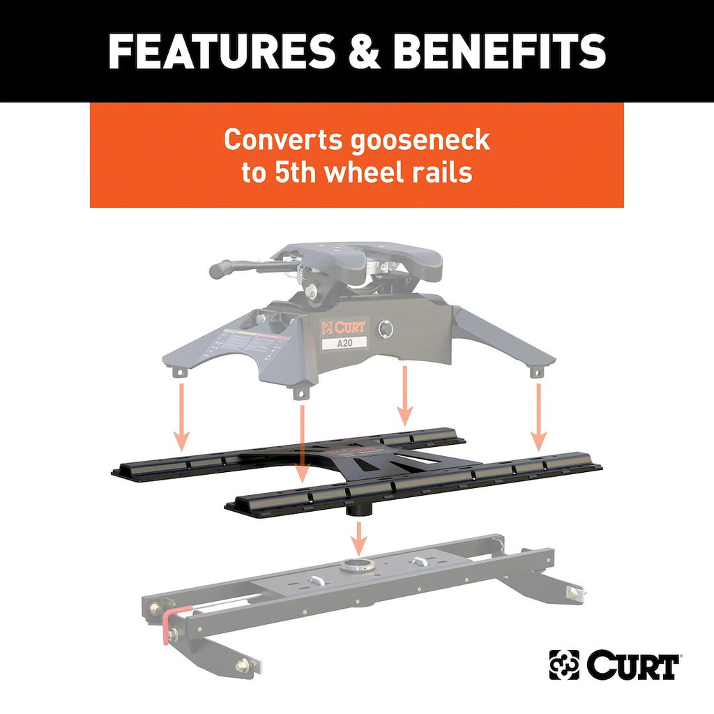 - Converts Double Lock Gooseneck Hitches to fifth wheel rails