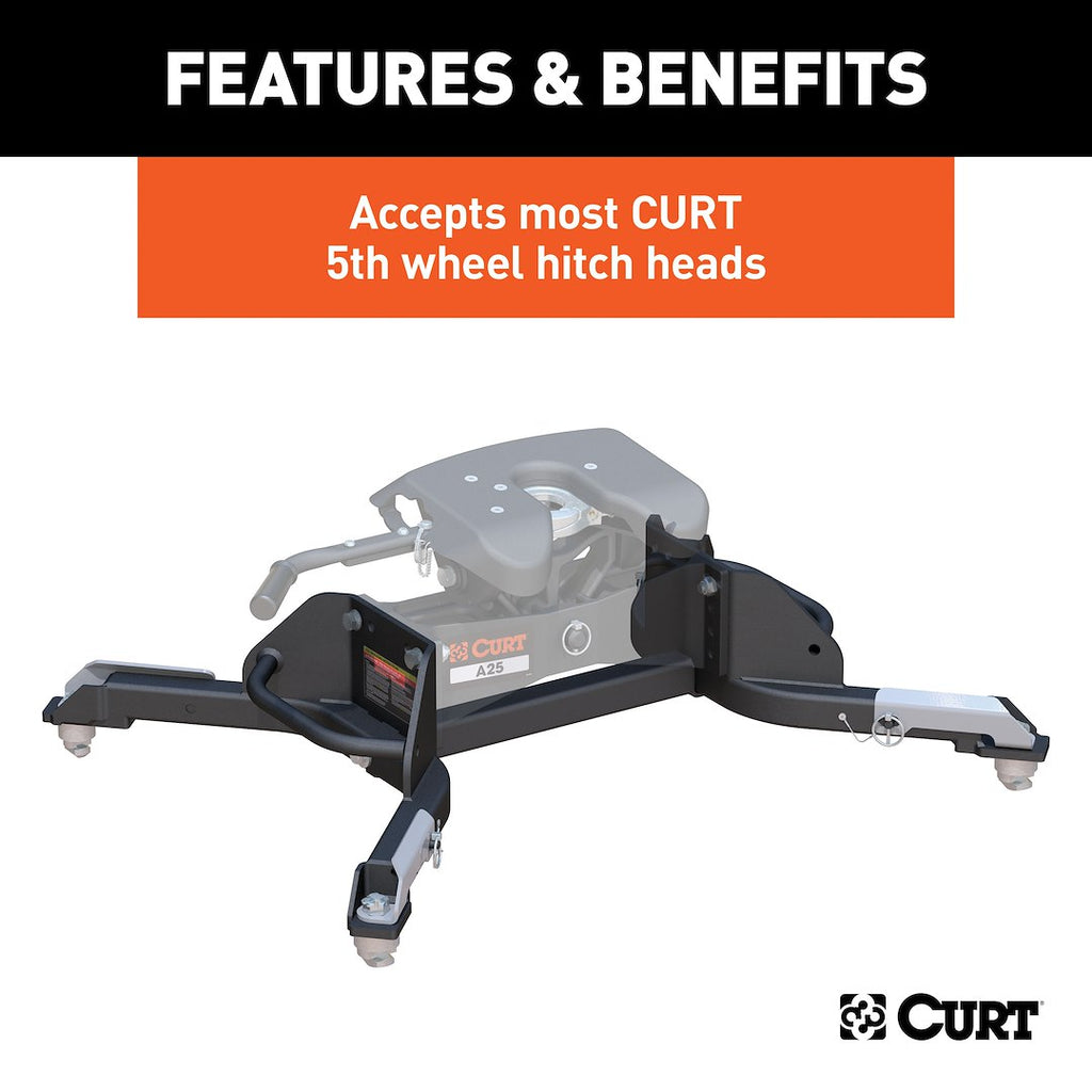 The CURT Fifth Wheel Trailer Hitch Head Support is designed to enhance the towing experience by providing a reliable and efficient solution for securing your CURT fifth wheel hitch. With a robust capacity of up to 25,000 pounds, these replacement legs are engineered for use with the CURT OEM puck system, ensuring a seamless fit for compatible truck models equipped with a towing prep package.