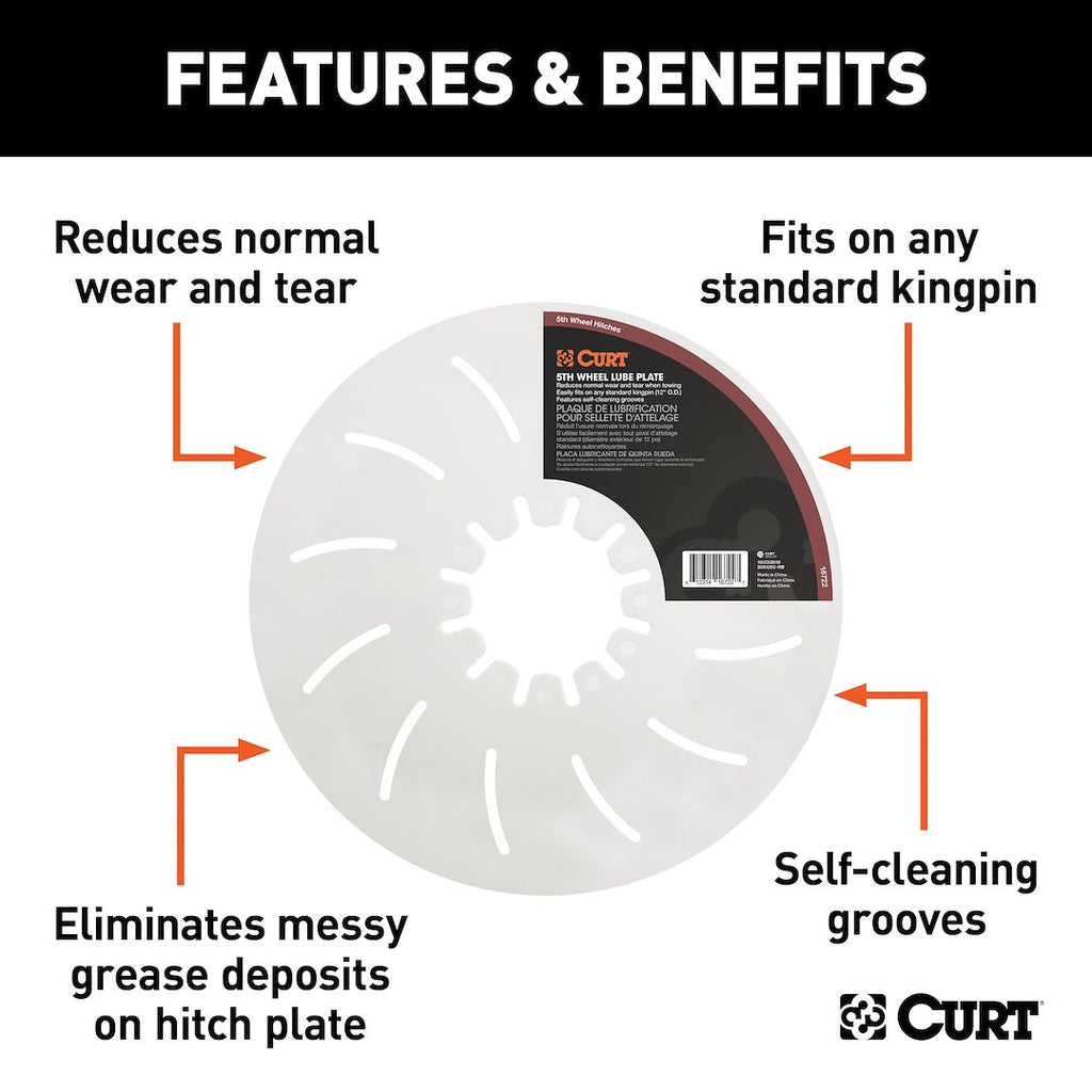 The CURT Fifth Wheel Trailer Hitch Lube Plate is designed to optimize the performance of your 5th wheel towing setup. This 12-inch disc provides essential protection for both your 5th wheel hitch and trailer, ensuring a smoother towing experience by minimizing wear and tear and preventing messy grease deposits.