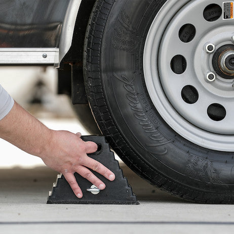 The Heavy Duty Rubber Wheel Chock with Chain Eye is designed to provide stability and safety for vehicles and trailers during servicing or parking. This robust wheel chock is particularly effective for use in shipping dock environments, ensuring that your equipment remains securely in place.