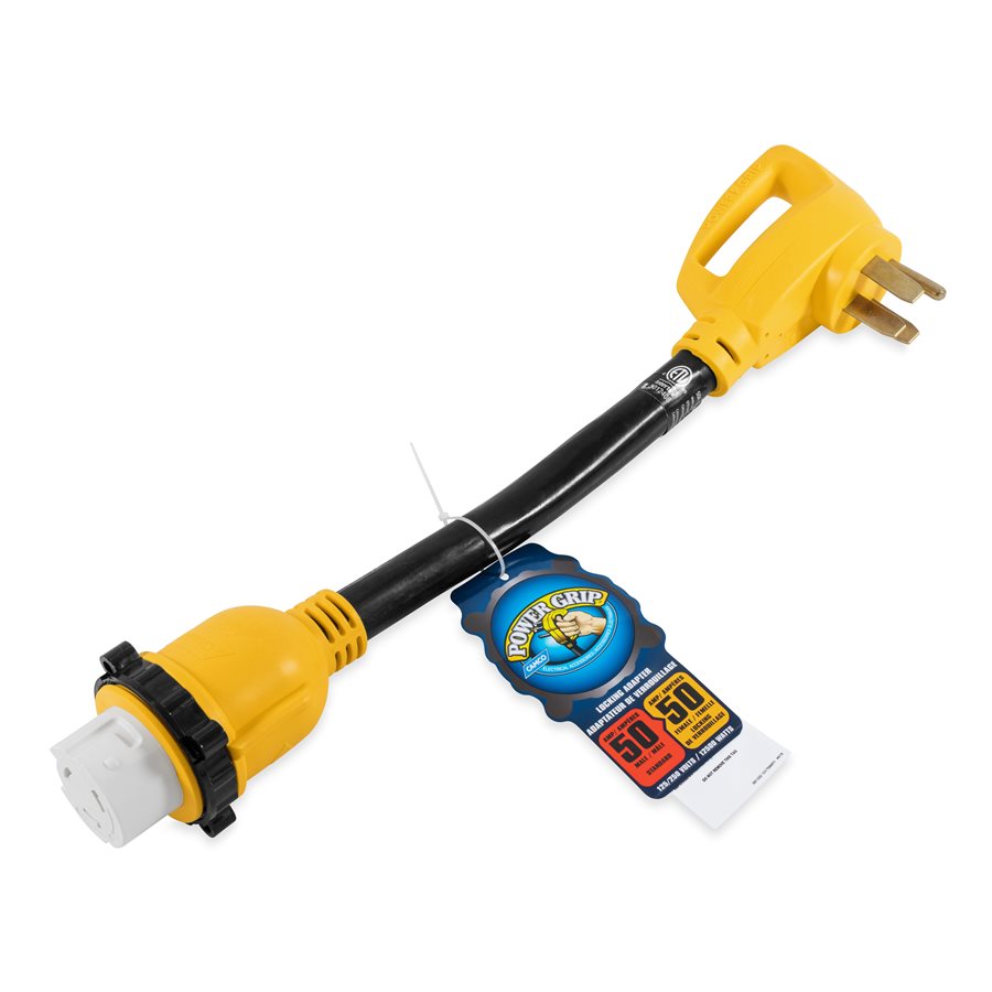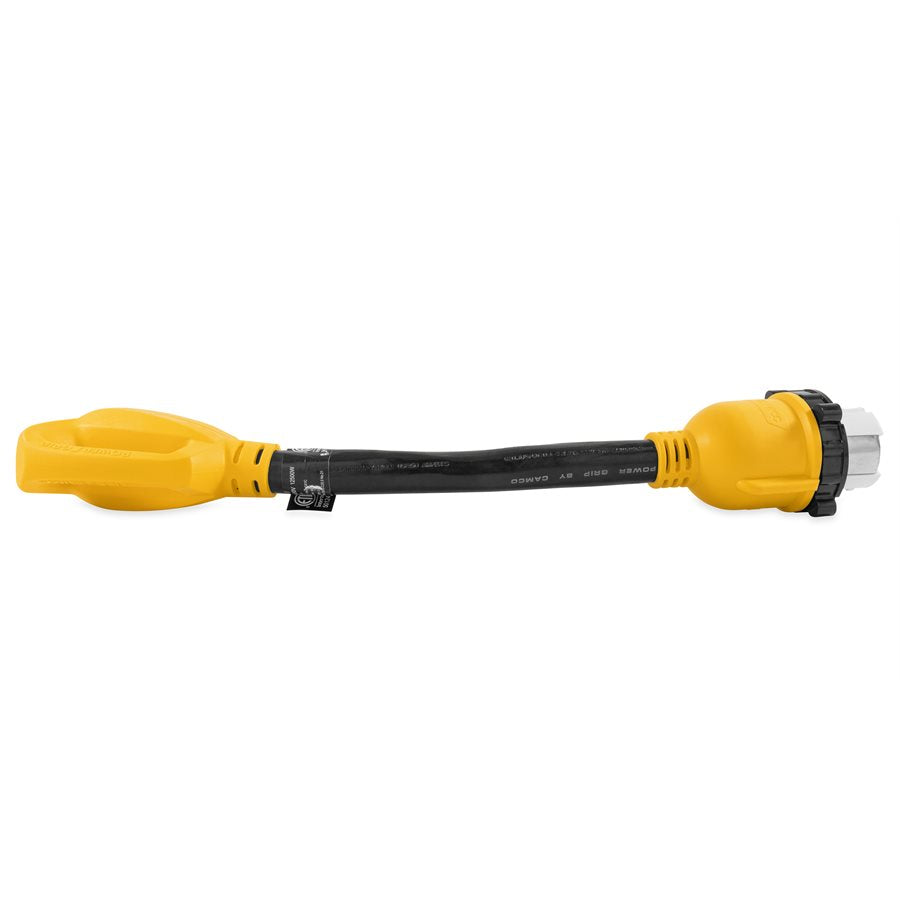 This 18-inch Power Grip adapter is designed to connect marine-style 50 AMP RV power inlets to standard 50 AMP power sources. Featuring a threaded locking ring, it ensures a weatherproof connection, making it suitable for outdoor use.