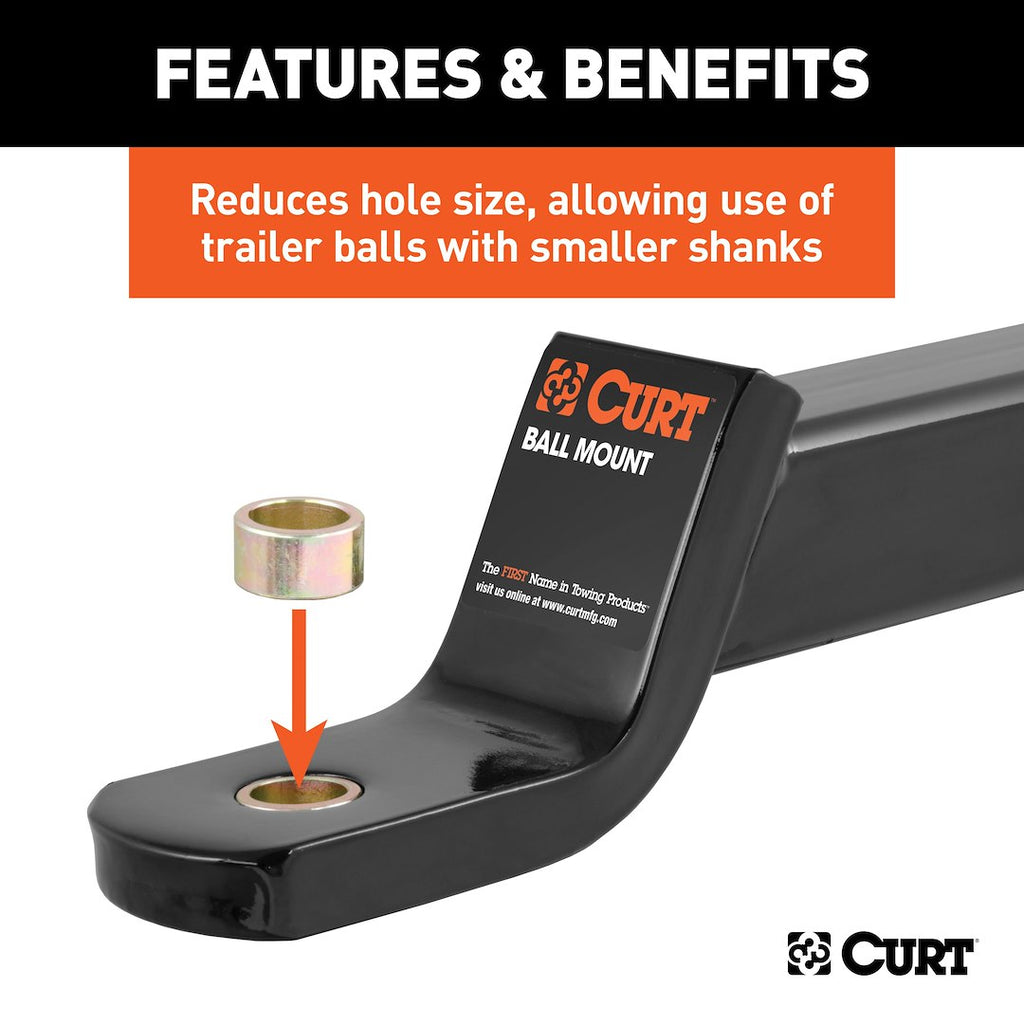 The CURT trailer hitch ball shank reducer is designed to provide a seamless fit between trailer balls and ball mounts of varying sizes. This reducer allows you to easily adapt a 1-inch diameter hole to accommodate a 3/4-inch shank, ensuring compatibility and enhancing the safety of your towing setup. Constructed from durable steel and finished with a protective yellow zinc plating, this reducer is built to withstand the rigors of towing while maintaining a secure connection.