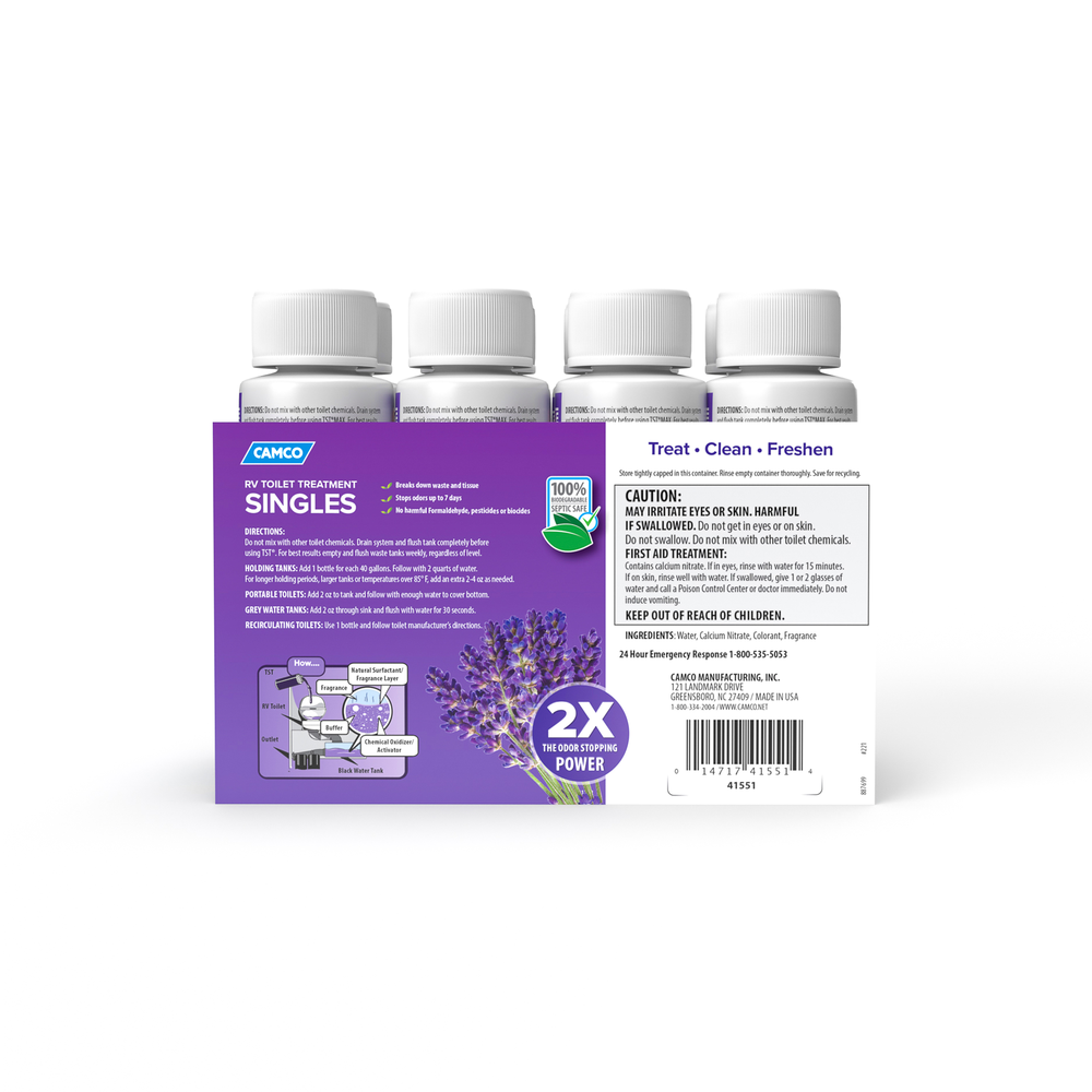 This waste holding tank treatment is designed to efficiently break down waste and tissue in RV and marine holding tanks. The ultra-concentrated formula utilizes a lavender scent to eliminate odors while lubricating sensors, ensuring optimal performance. Each 4-ounce bottle treats up to a 40-gallon tank, providing a total of eight treatments per package.