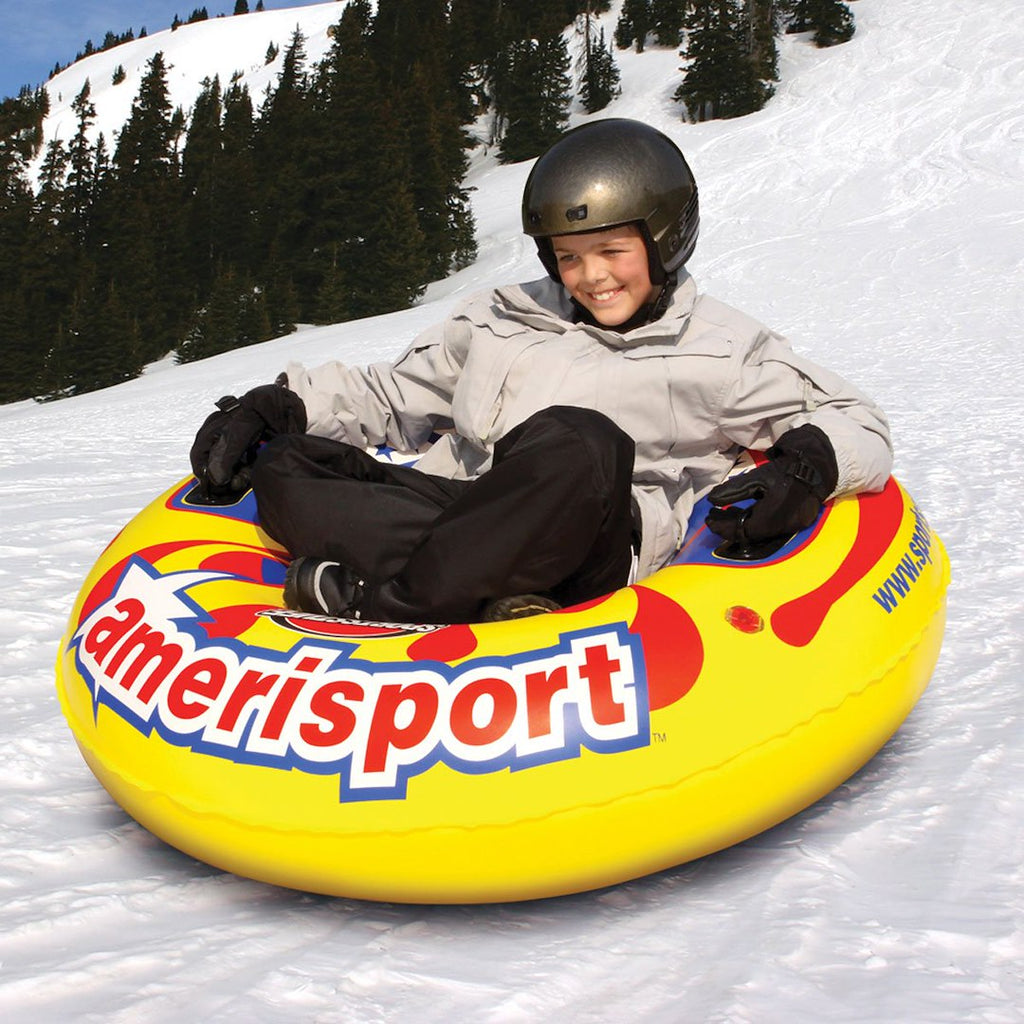 The Amerisport Snow Tube is a robust and oversized round tube designed for a single rider, accommodating up to 170 pounds. With a diameter of 48 inches when deflated, this snow tube is constructed from heavy-duty PVC featuring a Cold-Crack Additive, ensuring durability in various conditions. Whether you're sliding down snowy slopes or lounging in a pool or lake, the Amerisport is your go-to accessory for outdoor enjoyment throughout the year.
