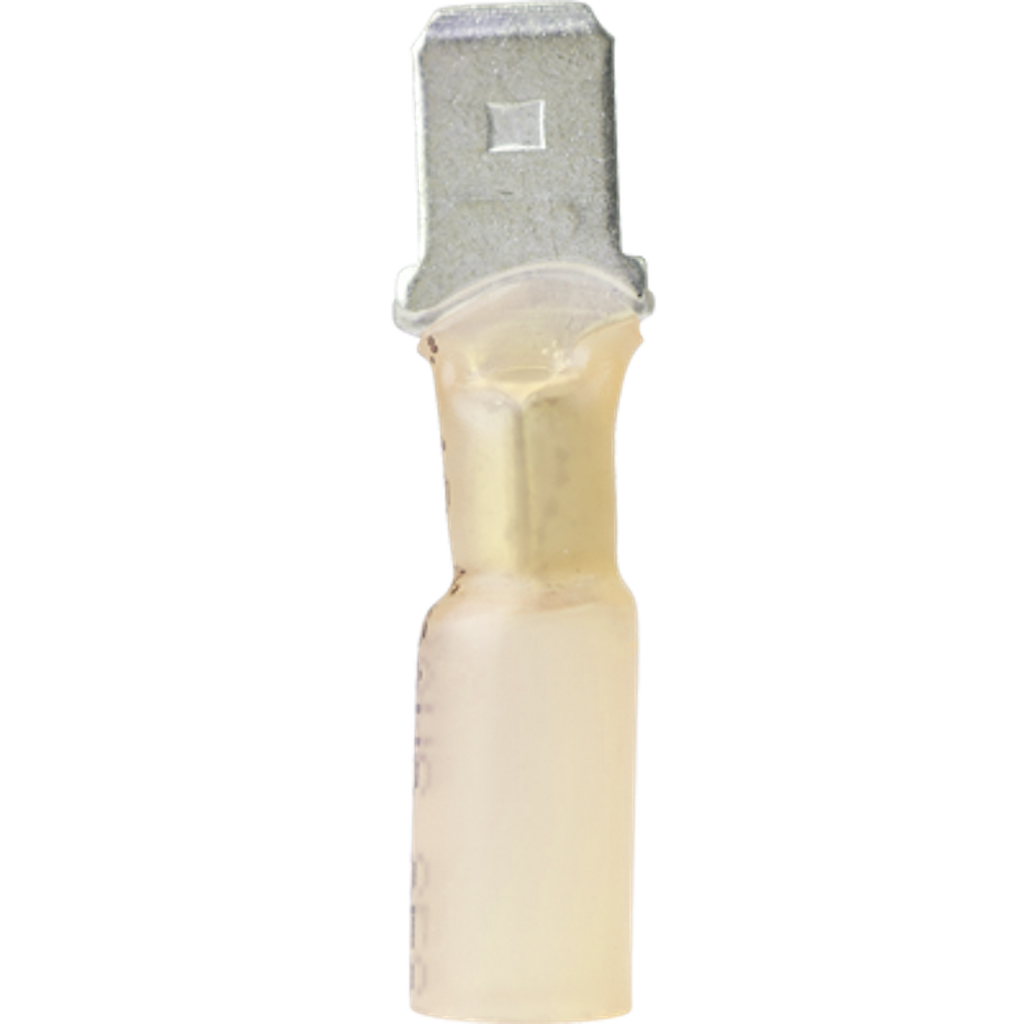 The Ancor 02-1249 Wire Terminal End is designed for secure and efficient electrical connections. This heat-shrink disconnect features a 1/4" male terminal suitable for 12 to 10 gauge wire, ensuring a reliable and water-tight seal when heat is applied. With its robust construction, this product is ideal for applications requiring durability and resistance to environmental factors.