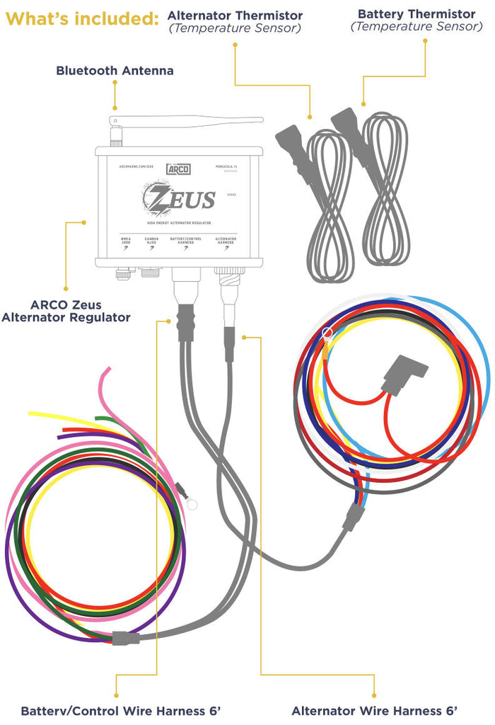 - Includes: 6 feet battery wiring harness, 6 feet alternator wiring harness, 2 thermistors