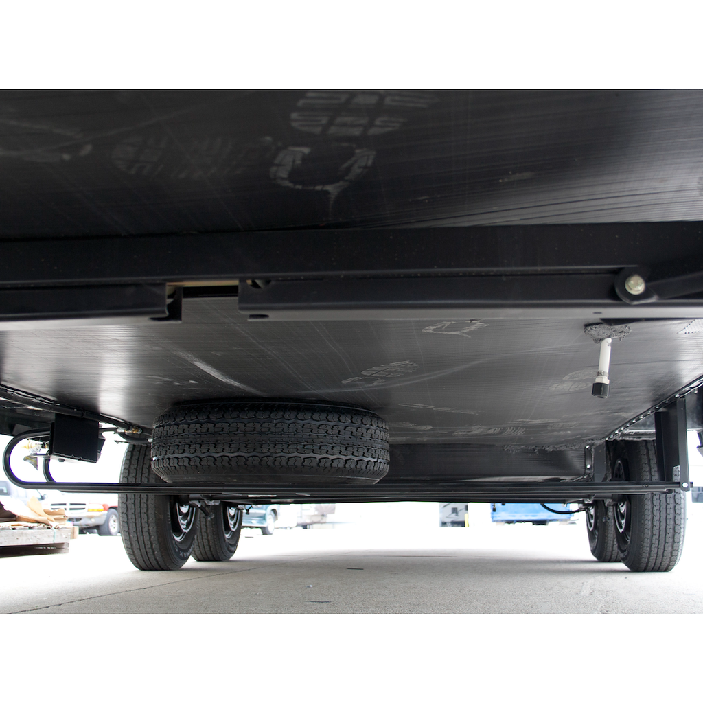 - Mounts the spare tire beneath the trailer, keeping it out of the way
