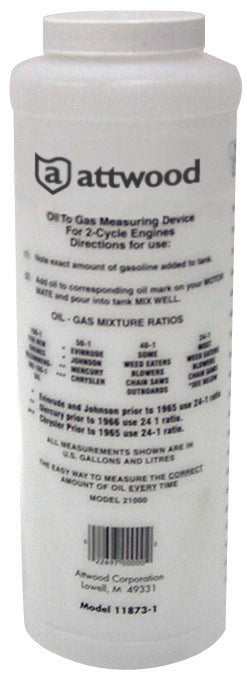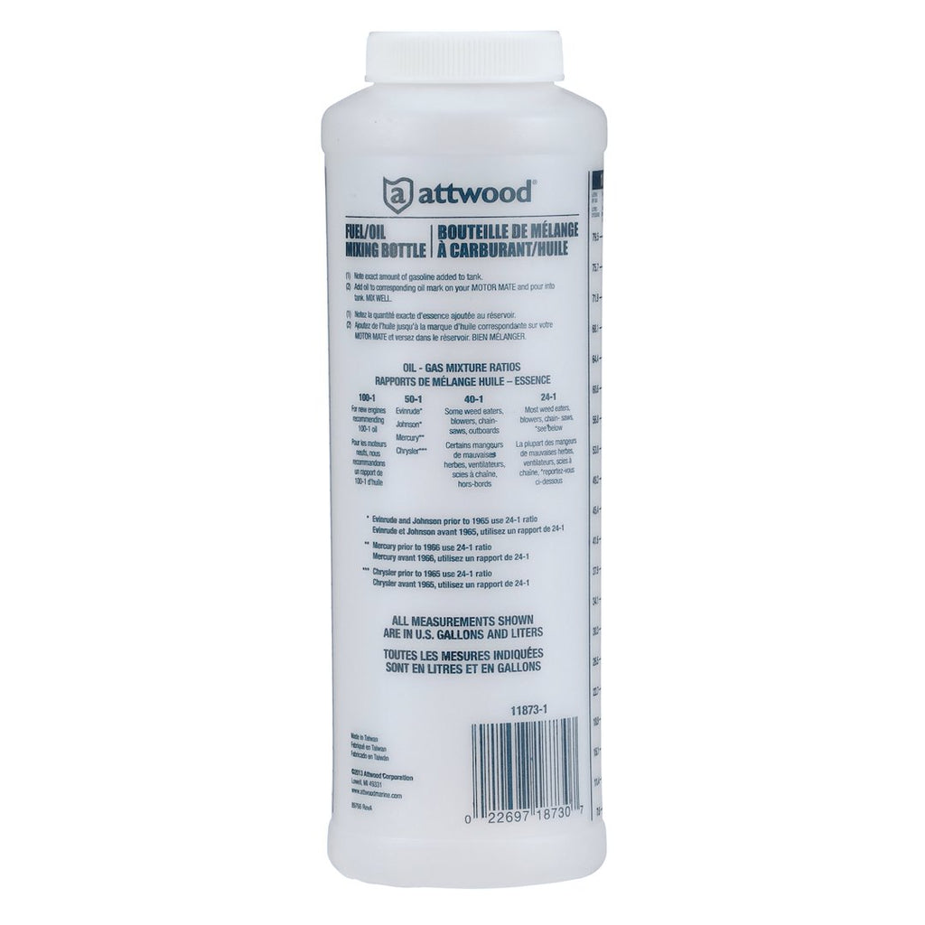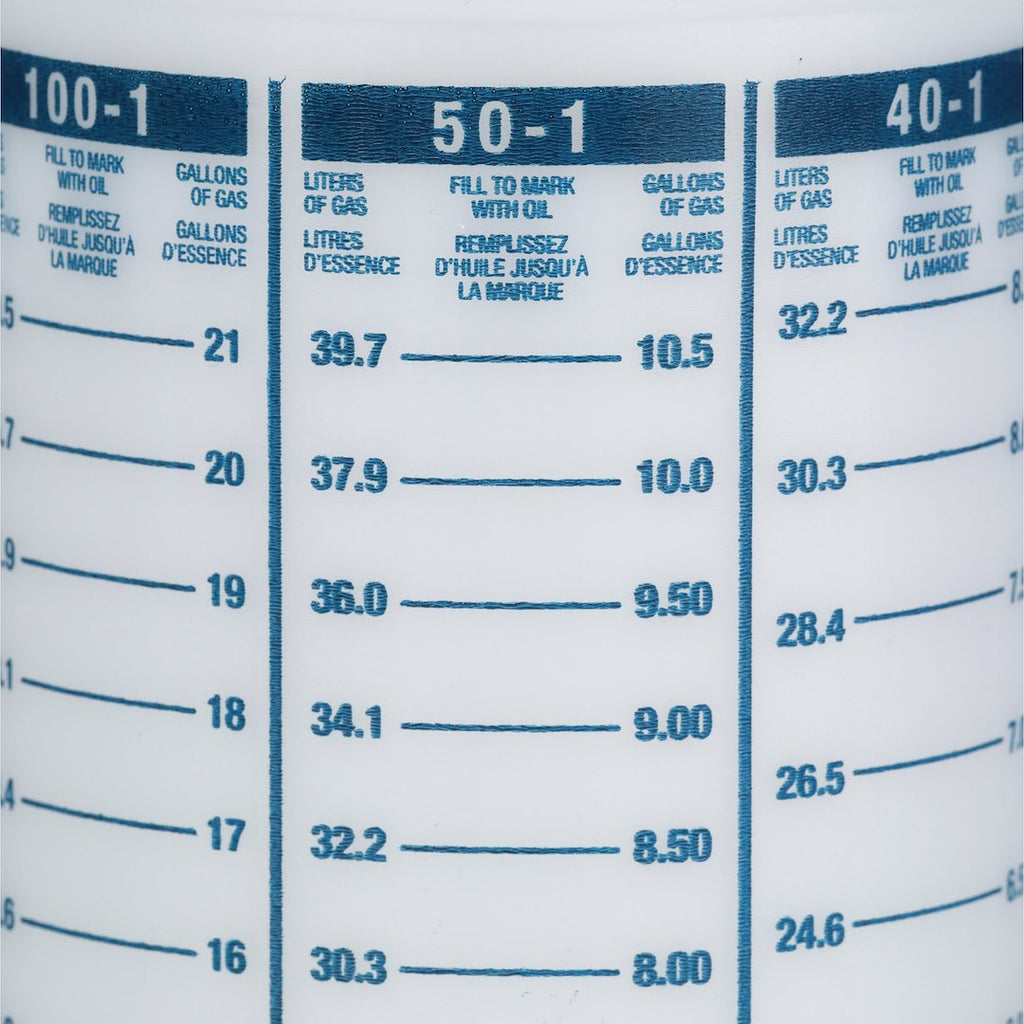 This Fuel and Oil Mixing Bottle is designed to accurately measure and mix fuel and oil for 2-cycle engines. With a capacity of 1 quart, it allows for precise determination of ratios including 100:1, 50:1, 24:1, and 10:1 mixes. The clear plastic construction features easy-to-read oil level marks in both gallons and liters, ensuring you add the exact amount of oil needed for optimal engine performance.