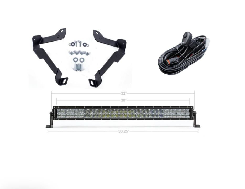 The Cali Raised LED Light Bar CR2566 is a high-performance lighting solution designed specifically for the 2014 to 2021 Toyota Tundra. This 32-inch dual-row light bar delivers an impressive 30,000 lumens, providing exceptional brightness and visibility for off-road adventures and nighttime driving. The custom-designed mounting kit ensures a secure fit within the lower bumper, maintaining the vehicle's original aesthetic while enhancing functionality.