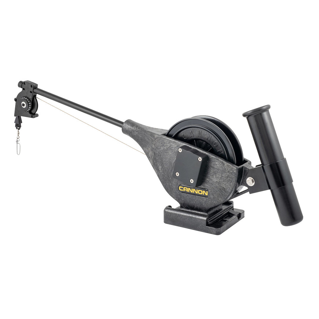 The Cannon Lake-Troll Downrigger is designed for smaller boats and novice anglers looking to enhance their fishing experience. This manual downrigger features a 1:1 retrieval speed ratio and a swivel-head dial depth counter, allowing for precise bait positioning and easy monitoring of depths. Constructed with a durable composite boom and spool, it is built to withstand the rigors of fishing while providing reliable performance.