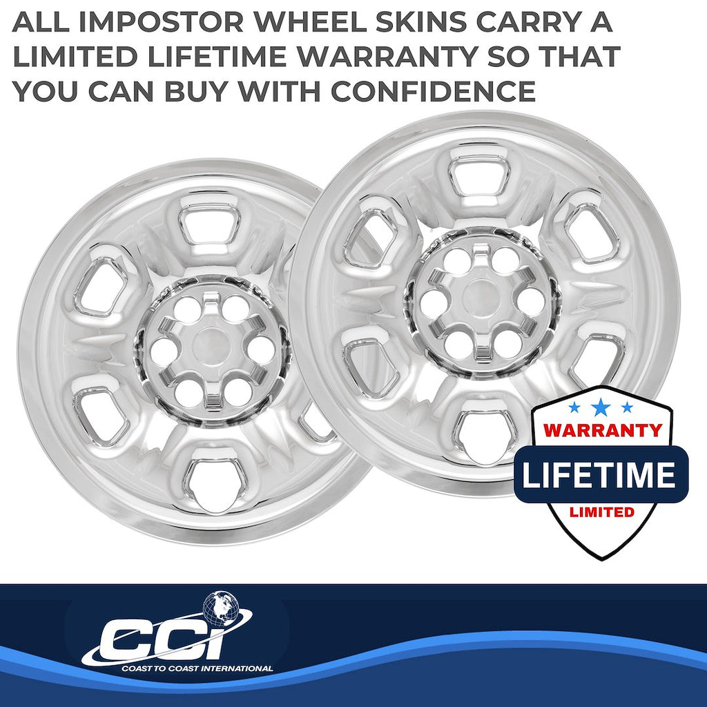 The Coast To Coast Impostor Wheel Skin is designed to transform the look of your car, pickup truck, or SUV. These 16-inch wheel skins are crafted from high-quality automotive grade ABS plastic and feature a chrome-plated finish, providing a sleek and stylish upgrade to your vehicle's original wheels. The snap-on design ensures a secure fit, making installation quick and hassle-free.