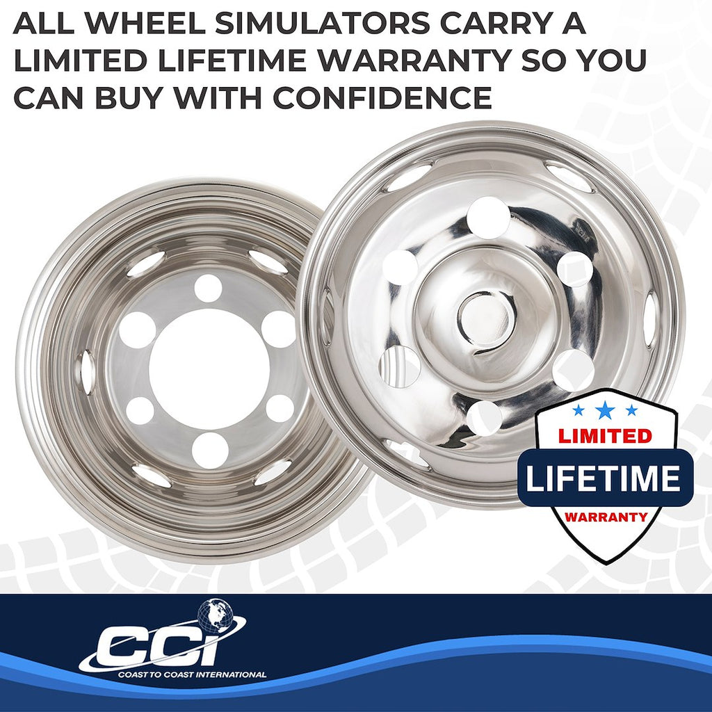 The Coast To Coast Wheel Simulator is designed to fit 16 inch dual rear steel wheels, providing a polished and refined look without the need for costly wheel replacements. Made from premium 304 stainless steel, these simulators not only enhance the aesthetic appeal of your vehicle but also protect your wheels from dirt, debris, and harsh weather conditions.