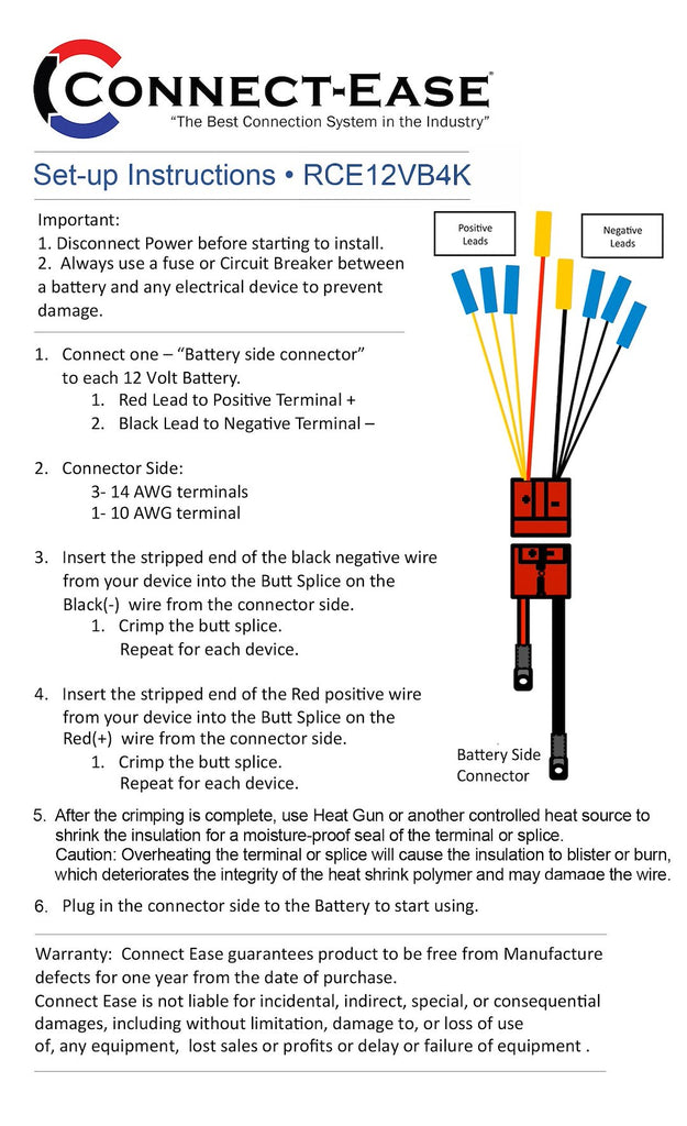 The Connect-Ease RCE12VB4K Battery Connection Harness is designed to simplify the connection of multiple marine accessories to a single 12-volt battery. This innovative harness allows for the seamless integration of up to four devices, including trolling motors, depth finders, and lights, ensuring reliable power distribution for your boating needs.