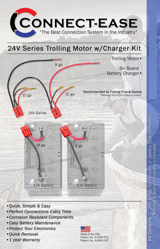 The Connect-Ease Trolling Motor Wiring Kit is designed to facilitate the connection of two 24-volt batteries in series, ensuring a reliable power source for your trolling motor. This innovative system features onboard charging leads and is constructed with 8-gauge marine-grade wire, making installation straightforward and efficient for serious fishing enthusiasts.