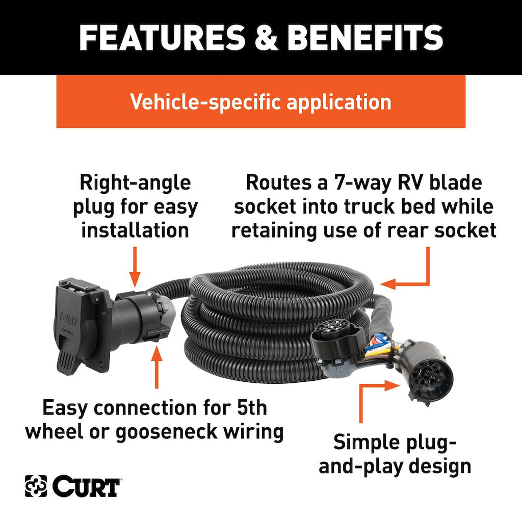 This CURT 10 Foot Trailer Wiring Connector Extension is designed to simplify the electrical connections for 5th wheel and gooseneck trailers. It provides a reliable and efficient way to connect your trailer's lighting and electrical systems while maintaining the functionality of your vehicle's rear socket.