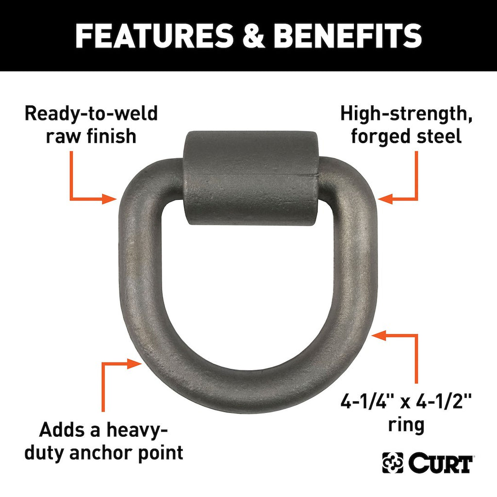 The CURT D-Ring Tiedown Anchor provides a robust solution for securing cargo during transport. Designed for welding onto metal frames, this anchor point is essential for safely managing ropes, cables, straps, or chains. With a high load capacity, it ensures that your cargo remains secure throughout your journey.