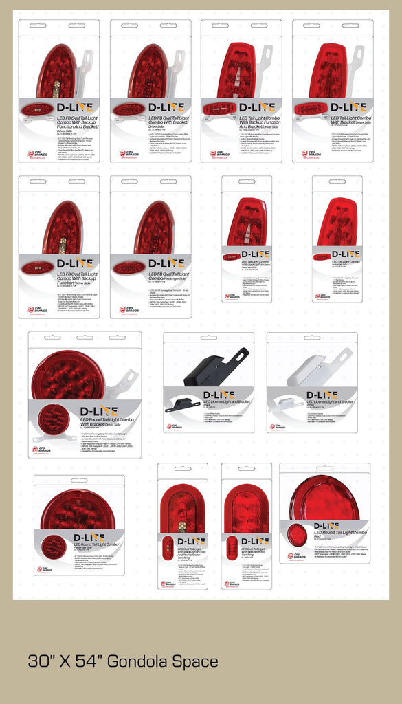 The D-Lite Interior and Exterior Lights Display is designed to provide a complete selection of essential LED lighting options for vehicles. This display features a well-organized layout showcasing various Stop, Tail, Turn, and Backup lights, making it an efficient choice for automotive professionals and enthusiasts alike.