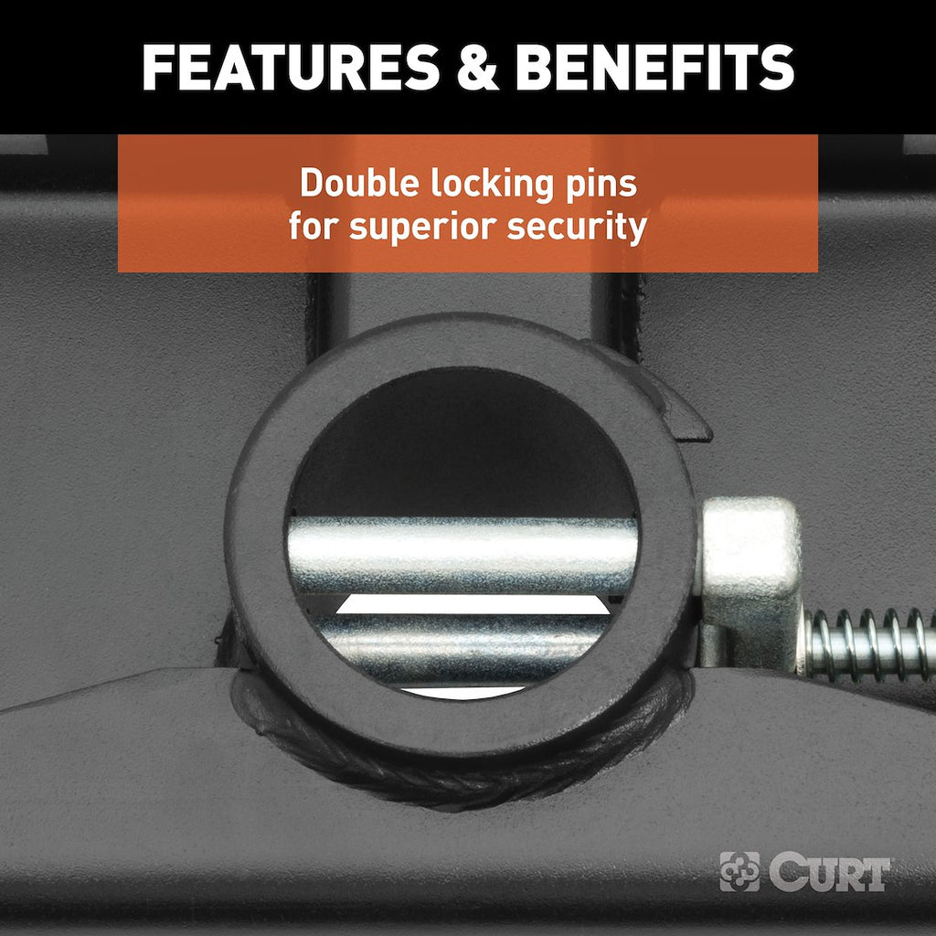 The CURT Double Lock EZr gooseneck trailer hitch is engineered for robust towing performance, featuring a weight capacity of 25,000 pounds. This under-bed hitch system simplifies installation and operation, making it an essential component for heavy-duty towing applications.